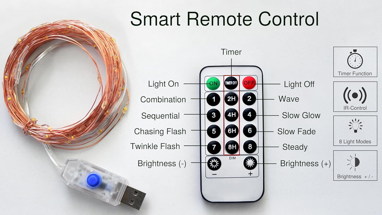 - Set the perfect mood, from a romantic twinkle to a steady warm white glow to a festive flash, to turn any room into the visual centerpiece of an elegant event or celebration; simply plug in the USB power and use the remote control or on-board button connected to the lights to cycle through eight lighting modes, brightness and timer to create a magical atmosphere. Because the entire string is USB powered, you have the freedom to place them anywhere without the hassle of cords.