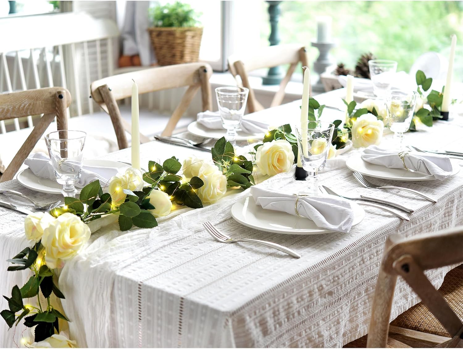 - Artificial white rose garlands with string lights can be used for various decorative purposes to create a charming and enchanting ambiance. Some specific uses for these garlands include: Wedding decorations: White roses symbolize purity and unity, making them a popular choice for weddings. These garlands can be used as table runners, draped along staircases, or as backdrops for wedding altars.