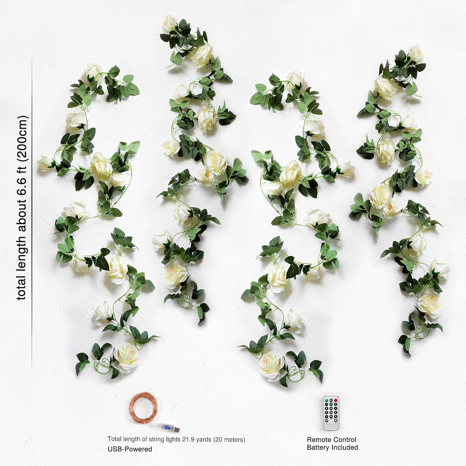 - What's Inside: 4 white rose garlands paired with 1 string of lights; presented in a FiveSeasonStuff gift-ready box; garlands and lights to be arranged; each garland is about 7.1 feet (2.16 meters) long. The string light measures 65.6 feet (20 meters) long, with 200 LEDs shining over copper wire string. Lights can be used independently. Lights are waterproof but USB is not.
