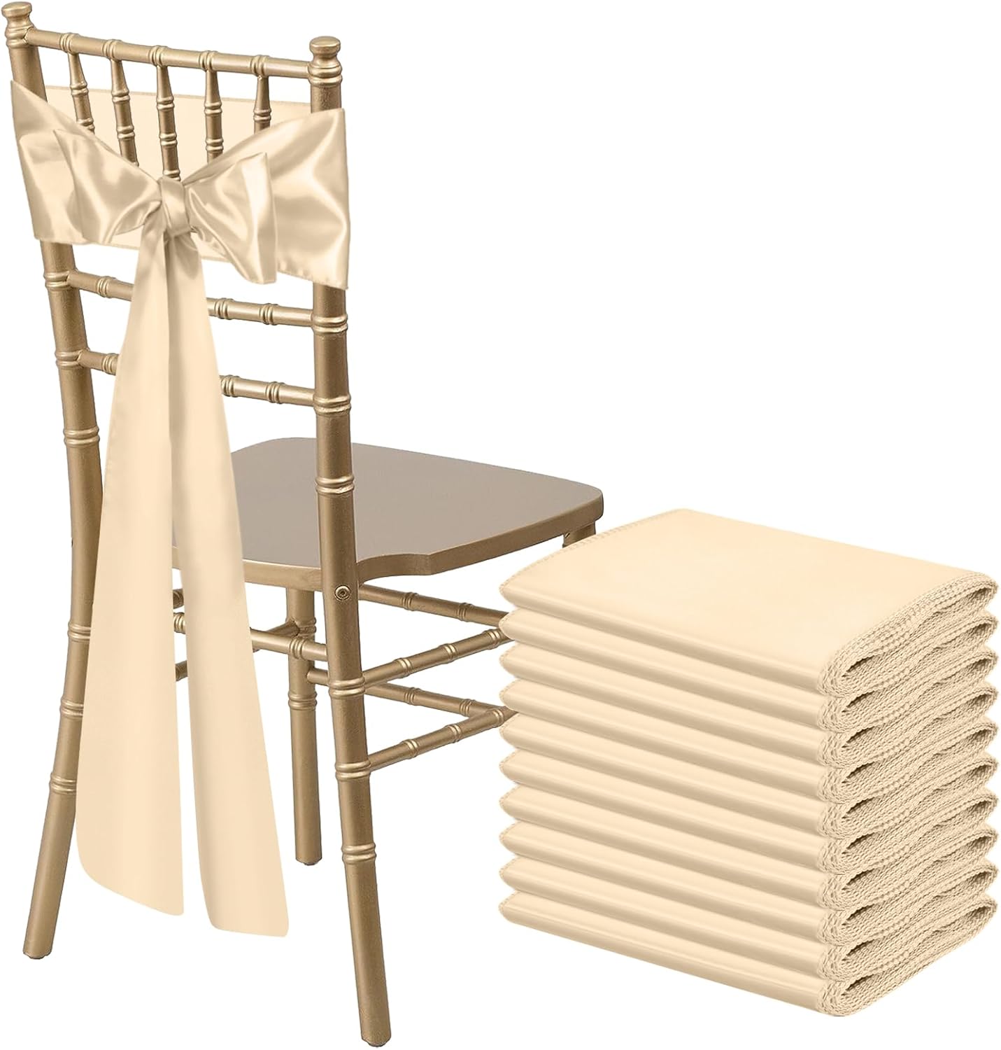 - Size & Package:You will get 10 pieces gold satin chair sashes, and the size is about 108" x7" or 275cm(l) x 17cm(w). These chair ties adopt flating packing, please to tie the bow by yourself. Each package includes chair sashes only, no chair covers