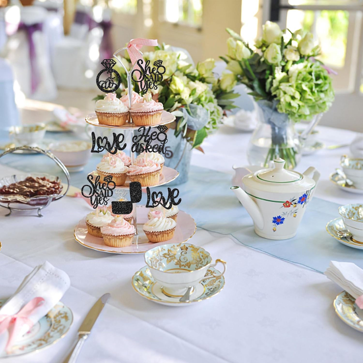 30 PCS He Asked She Said Yes Cupcake Toppers Love I Do Diamond Ring Cupcake Picks for Wedding Enaggement Bridal Shower Party Cake Decorations Supplies Black