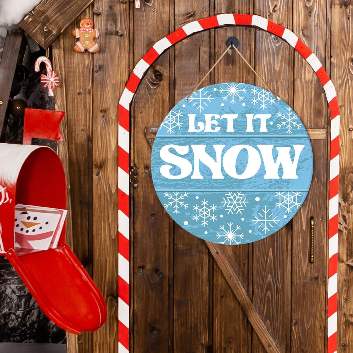 Muktoujaumai Winter Sign Front Door Decor, Christmas Round Hanging Sign Decor Snowflake Xmas Holiday Wall Decorations Winter Wood Sign for Door, Porch, Home, Let It Snow