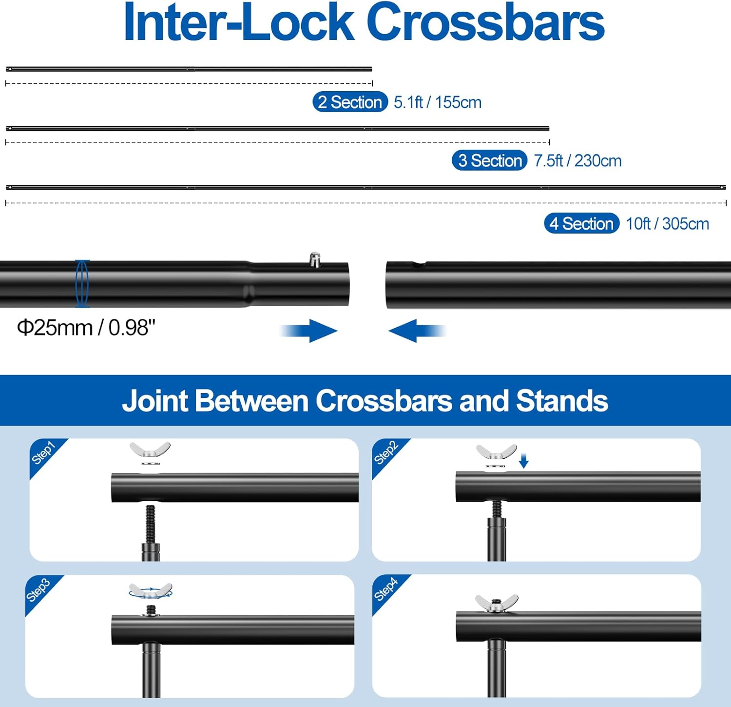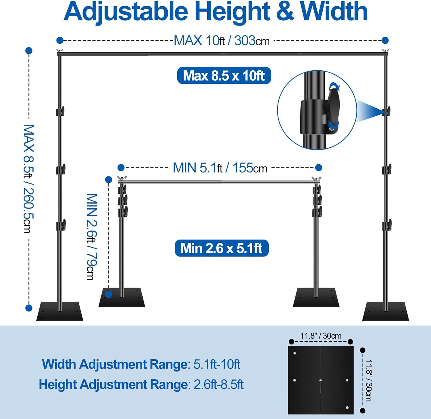 - 【Adjustable Height & Width】Backdrop stand adopts aluminum alloy construction, long-lasting and sturdy. Height and width adjustable with good flexibility, height can be adjusted from 2.6ft-8.5ft, telescopic crossbars width can be adjusted from 5.2ft to 10ft. Loading capacity up to 28lb. Easy to assemble and disassemble in just a few minutes.