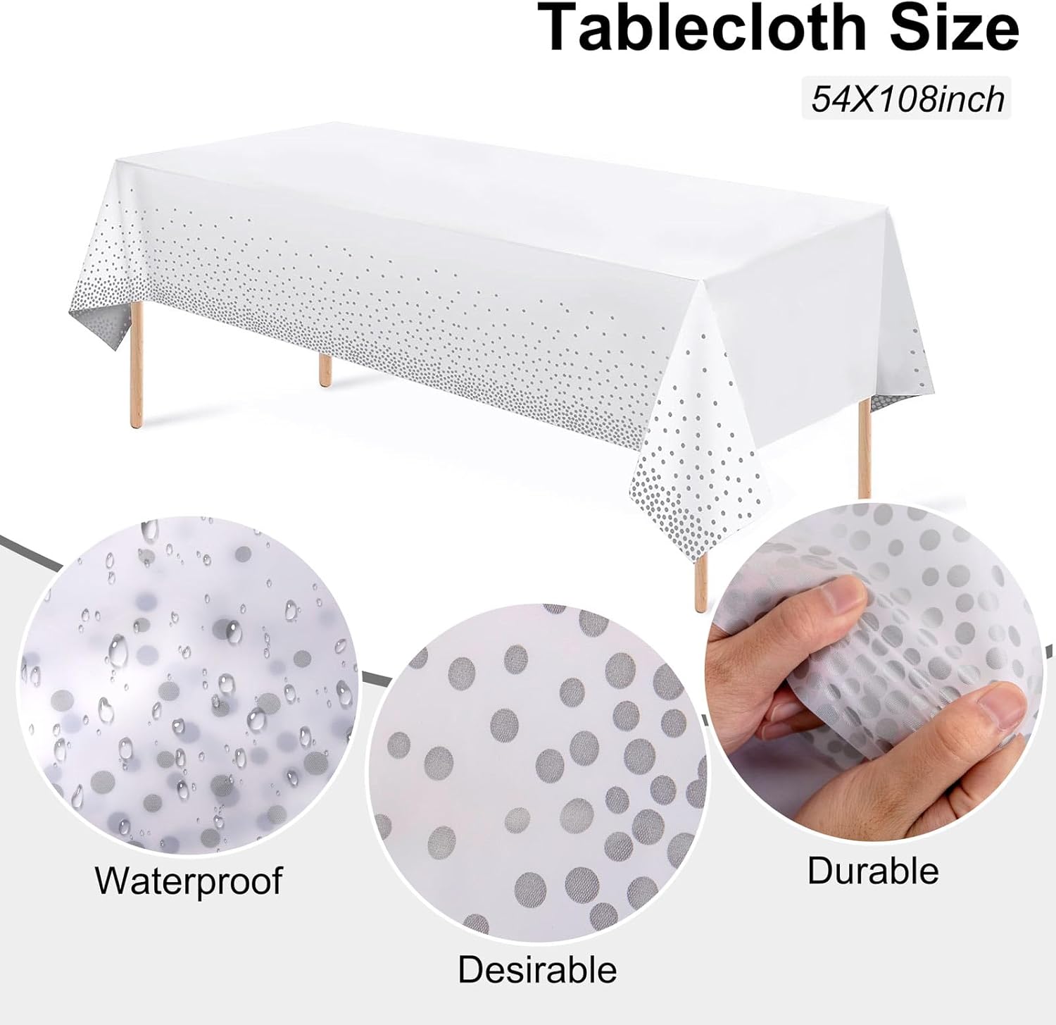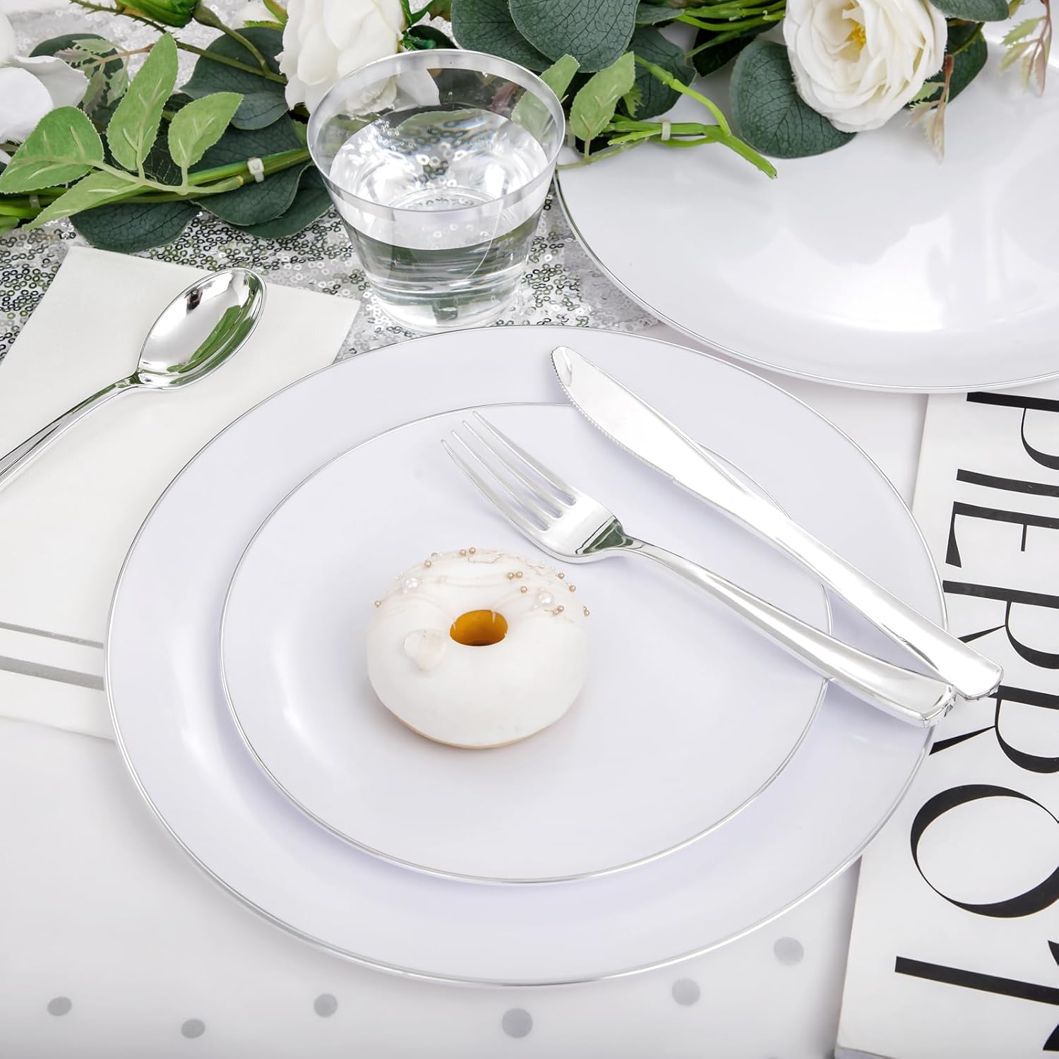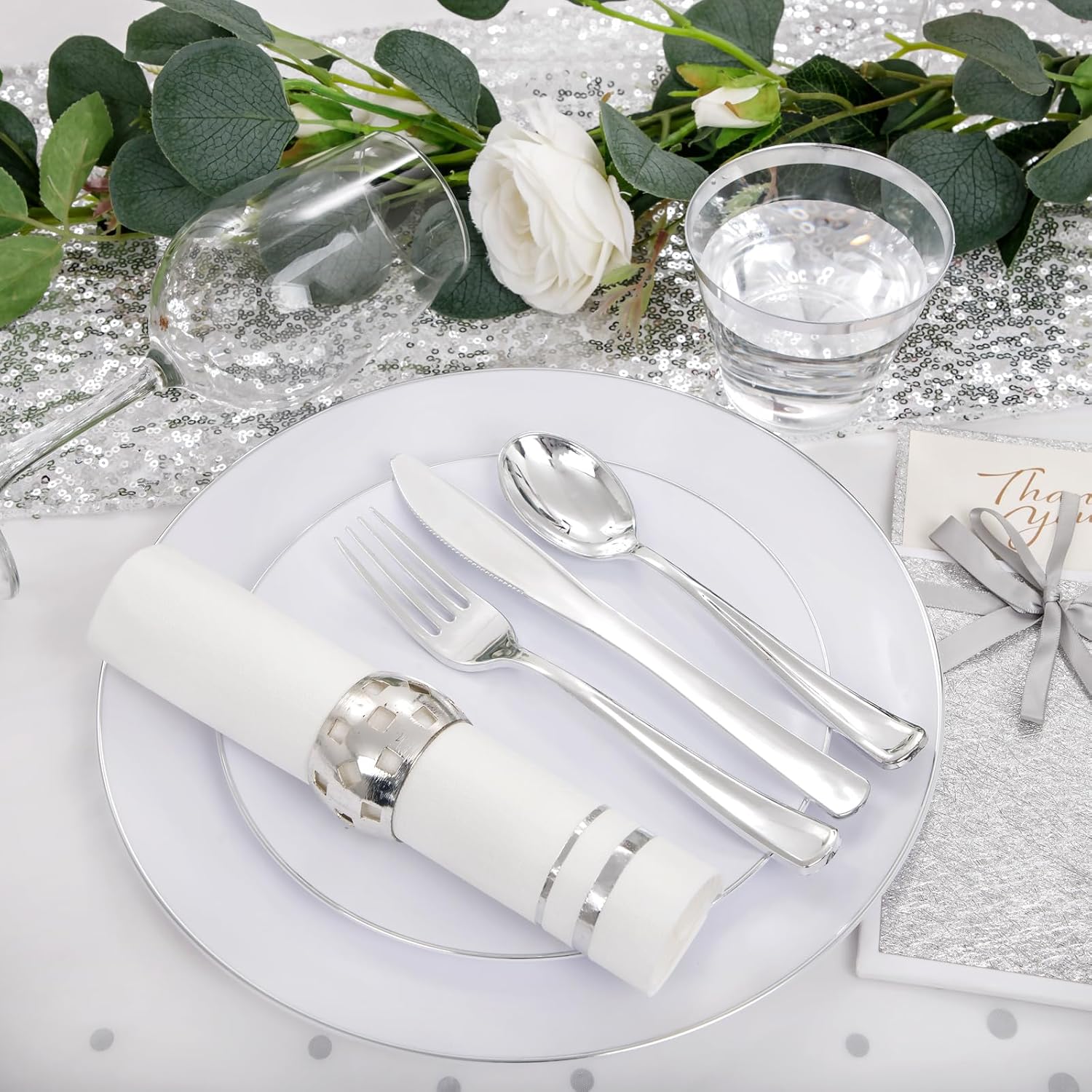 - COMPLETE SET:This white plastic plates with silver rim set includes 50 silver rimmed plastic dinner plates and 25 silver rimmed cups, 25 silver cutlery, 25 paper napkins 13*15.7 inches (unfolded size), 25 silver plastic cups, and 1 plastic tablecloth 54*108 inches (unfolded size), providing you with a sumptuous choice of meals and drinks, and the silver plastic plates can be used to serve a variety of dishes and drinks.
