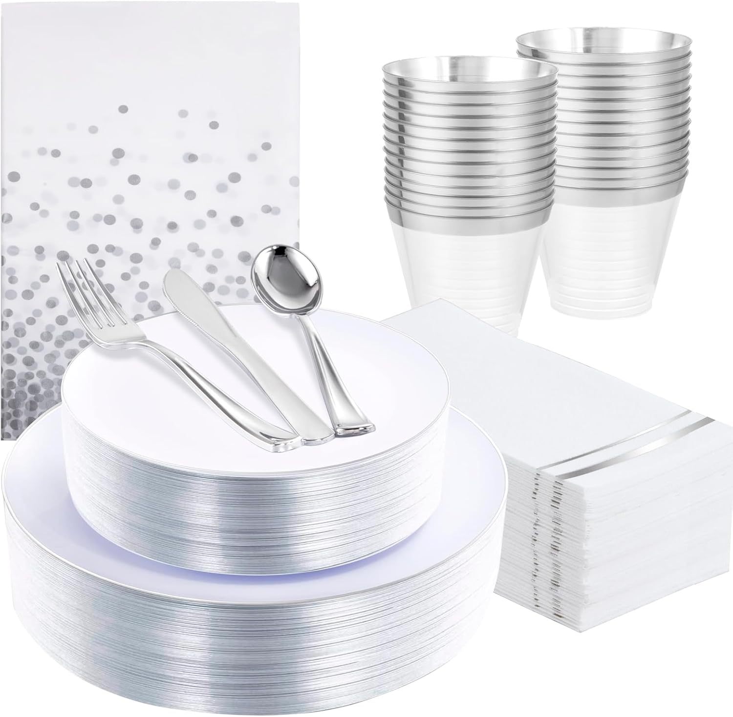 - EXQUISITE SILVER APPEARANCE:Our Sliver Plastic Wedding Party Plates are known for their sophisticated silver look and add a luxurious touch to your special occasion, these party plates and cups and napkins sets will make your party a feast for the eyes.