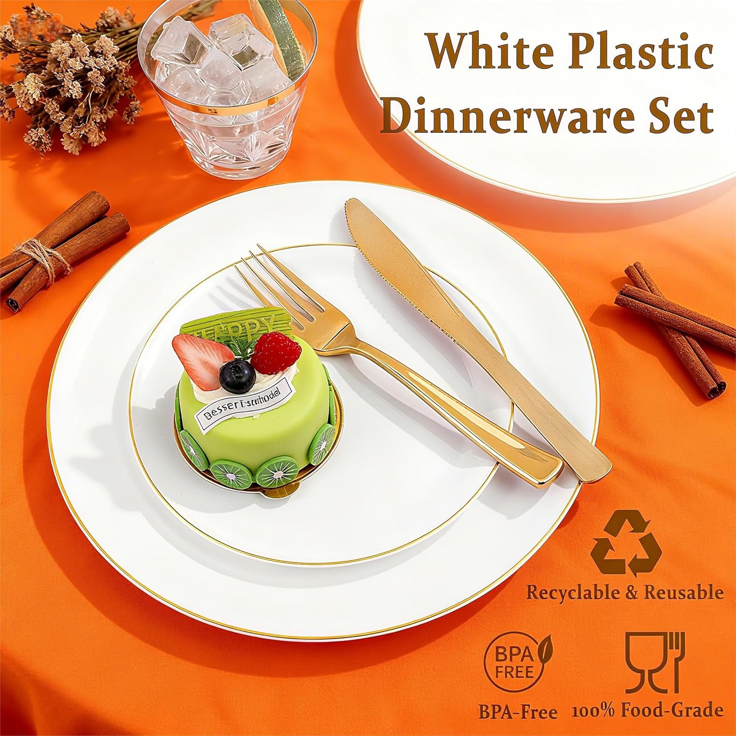 - HIGH-QUALITY:These white plastic plates with gold rim are made from high quality food grade plastic that is BPA free and non-toxic, ensuring their durability and reliability. Our disposable plates are suitable for all types of food, whether it's an entree, dessert, cake or appetizer.