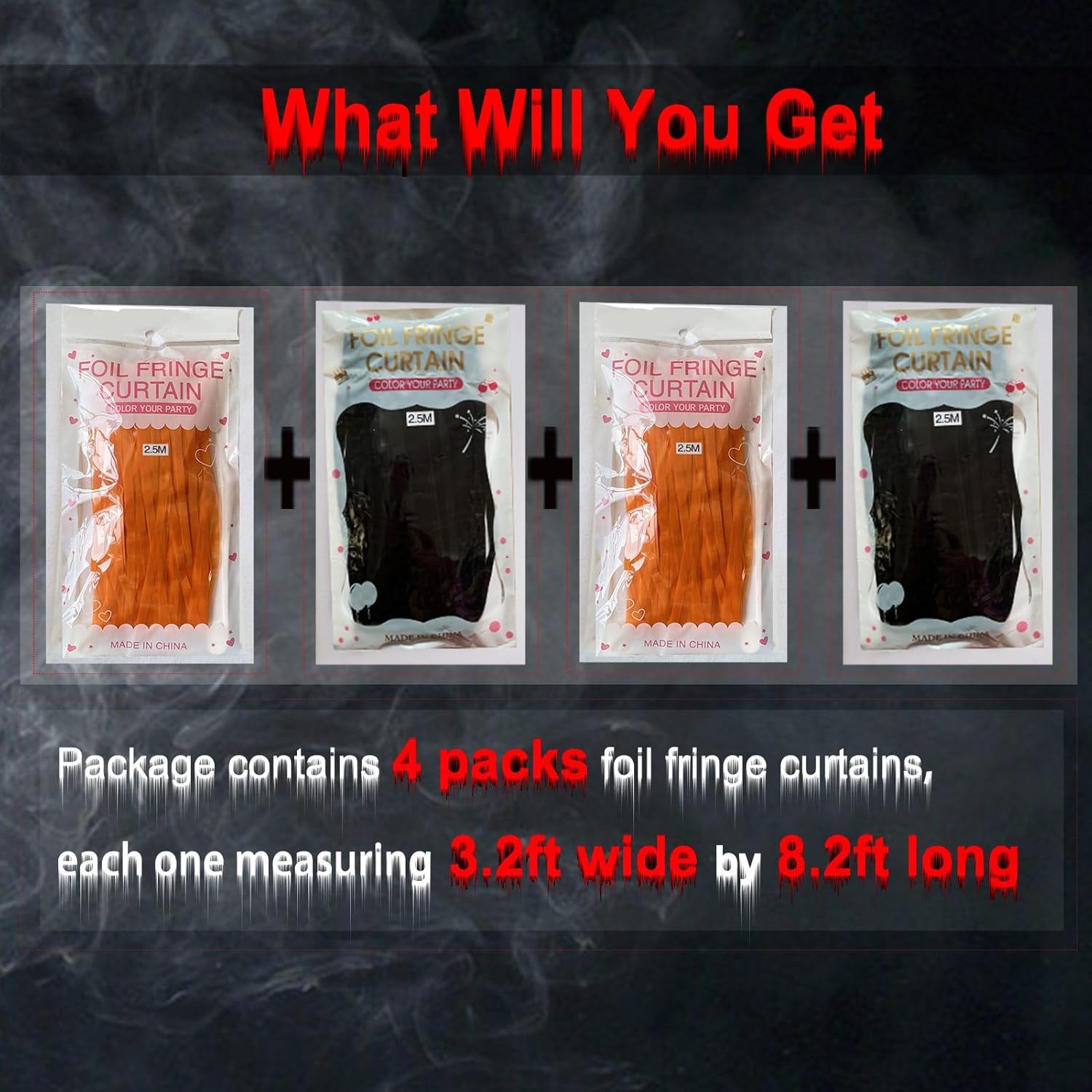 - ORANGE BLACK METALLIC TINSEL FOIL FRINGE CURTAINS: The package includes 4packs foil fringe backdrop curtains(2pack orange +2pack black), each metallic tinsel curtain is 3.2ft(wide)×8.2ft(drop), wonderful accessories for decorating doorway, window and walls. This stunning foil fringe curtain has a metallic finish that will add a touch of glamour to your party.