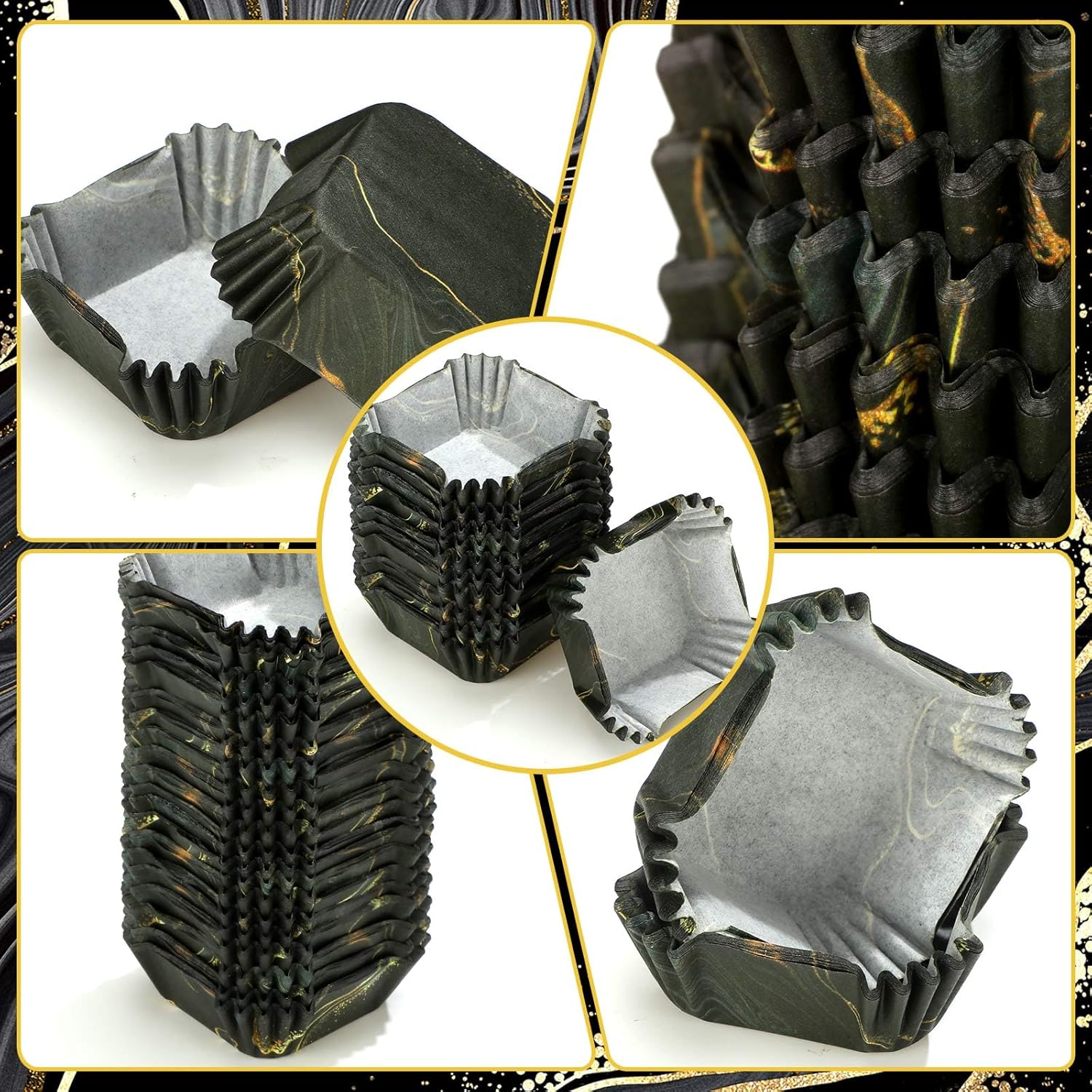 - Square Shape: the square paper baking cups are waterproof and oil proof, bringing you a nice use experience, besides the square shape and black gold marble print can go well with most styles of desserts