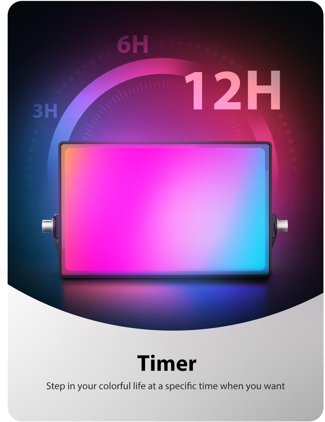 - Timing & Memory Function: Timing function allows you to set the working time (3 / 6 / 12 h), this uplights will automatically turn off when setting time is up; Memory Function makes these color-changing spotlights stay at your last set of colors and light display mode when turning on again; No need to reset it