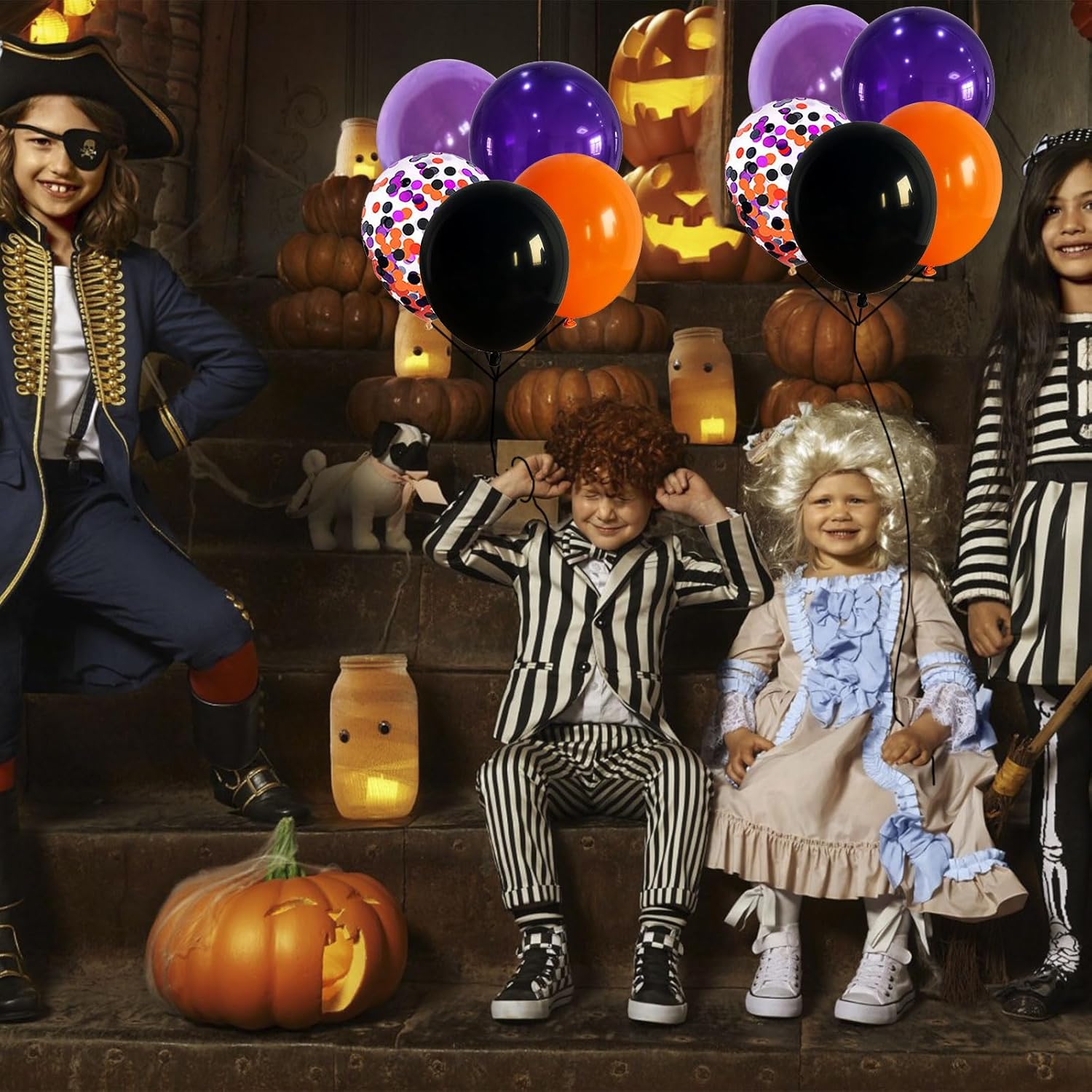 - ๐ Halloween Party Decoration Balloon - 60 Pack Halloween balloon kit: 12Inch 10Pcs Dark Purple Balloons, 12Inch 10Pcs Purple Balloons, 12Inch 15Pcs Black Balloons, 12Inch 15Pcs Orange Balloons, 12Inch 10Pcs Orange Black Purple Confetti Balloons and 1pc balloon ribbon. It's the perfect addition to Halloween party or event, creating an atmosphere of fun that everyone enjoy.