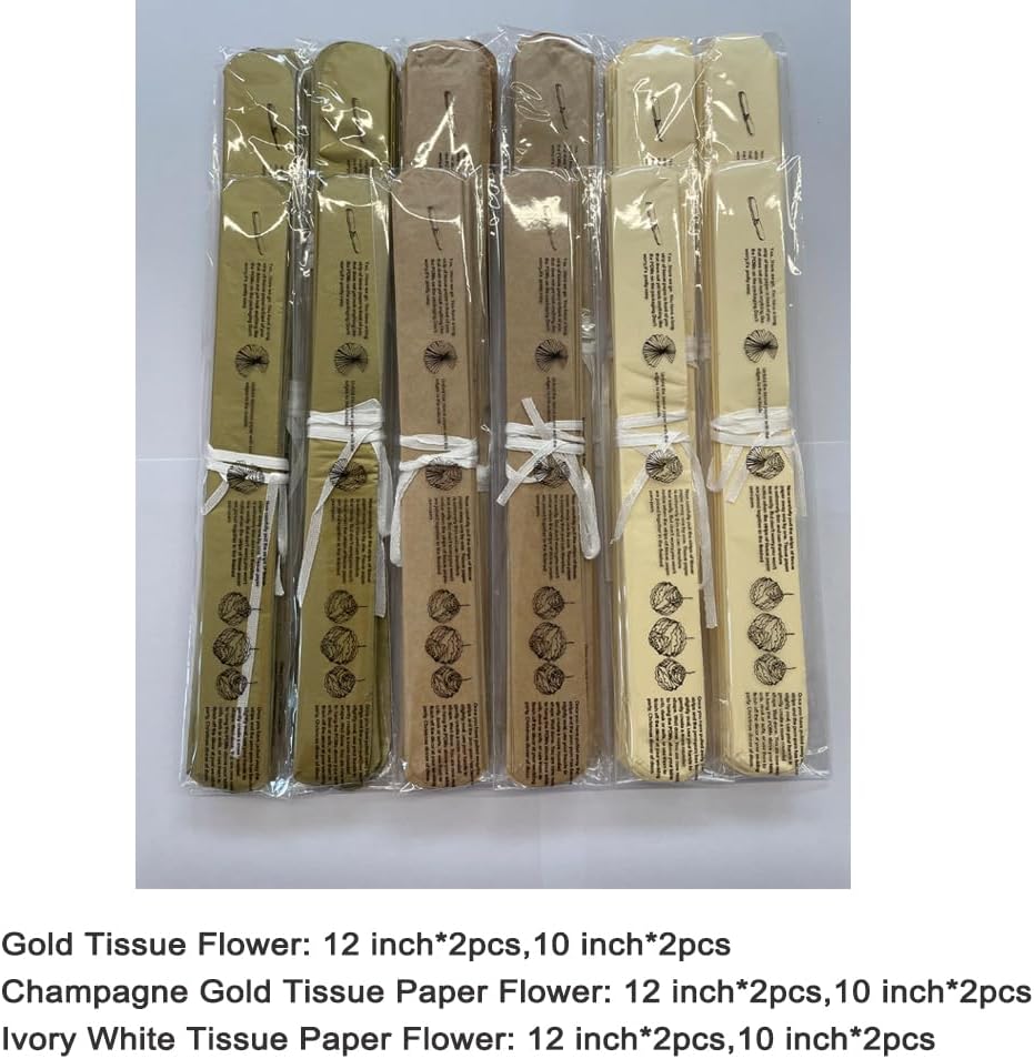 - Tissue Paper Flower Gold Champagne Gold and White 12pc in 2 sizes,package include gold crafts flower 4pc (2pc in 12'' and 2pc in 10''), champagne gold crafts flower 4pc(2pc in 12'' and 2pc in 10''), white crafts flower 4pc(2pc in 12'' and 2pc in 10'')