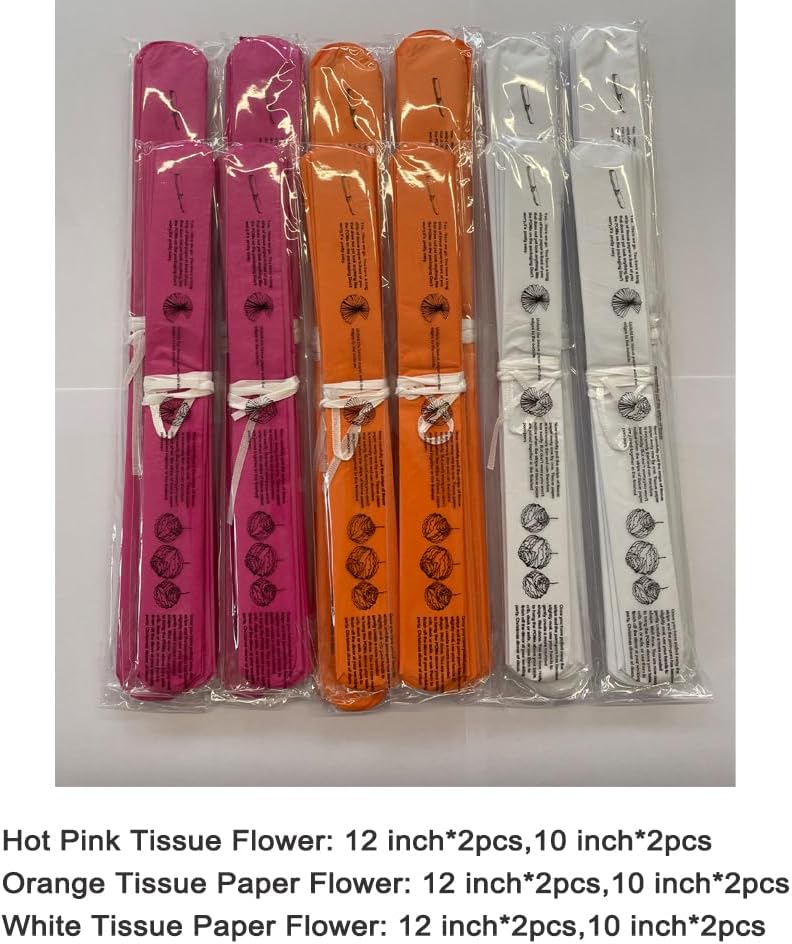 - Tissue Paper Flower Hot Pink and Orange 12pc in 2 sizes,package include hot pink crafts flower 4pc (2pc in 12'' and 2pc in 10''), orange crafts flower 4pc(2pc in 12'' and 2pc in 10''), white crafts flower 4pc(2pc in 12'' and 2pc in 10'')