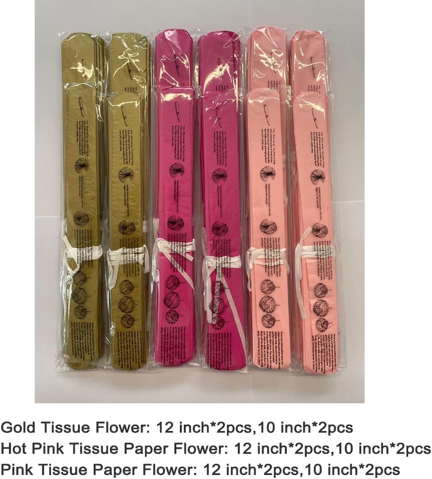 - Tissue Paper Flower Gold Hot Pink and Pink 12pc in 2 sizes,package include gold crafts flower 4pc (2pc in 12'' and 2pc in 10''), hot pink crafts flower 4pc(2pc in 12'' and 2pc in 10''), pink crafts flower 4pc(2pc in 12'' and 2pc in 10'')