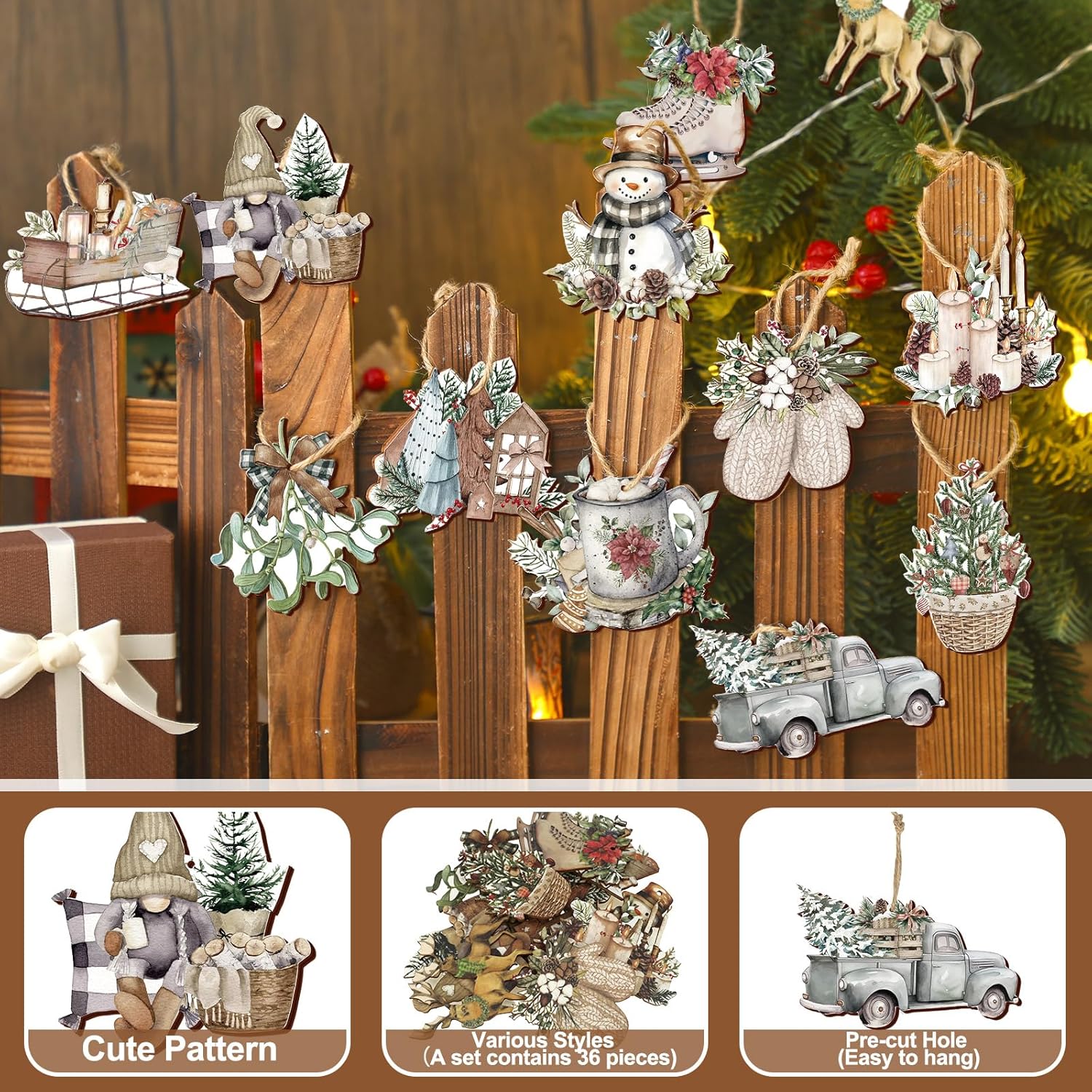 Suzile 36 Pcs Christmas Wooden Ornaments Vintage Christmas Tree Ornaments Xmas Decorations for Tree Wreaths Xmas Hanging Wood Cutouts Decor for Home Winter Party