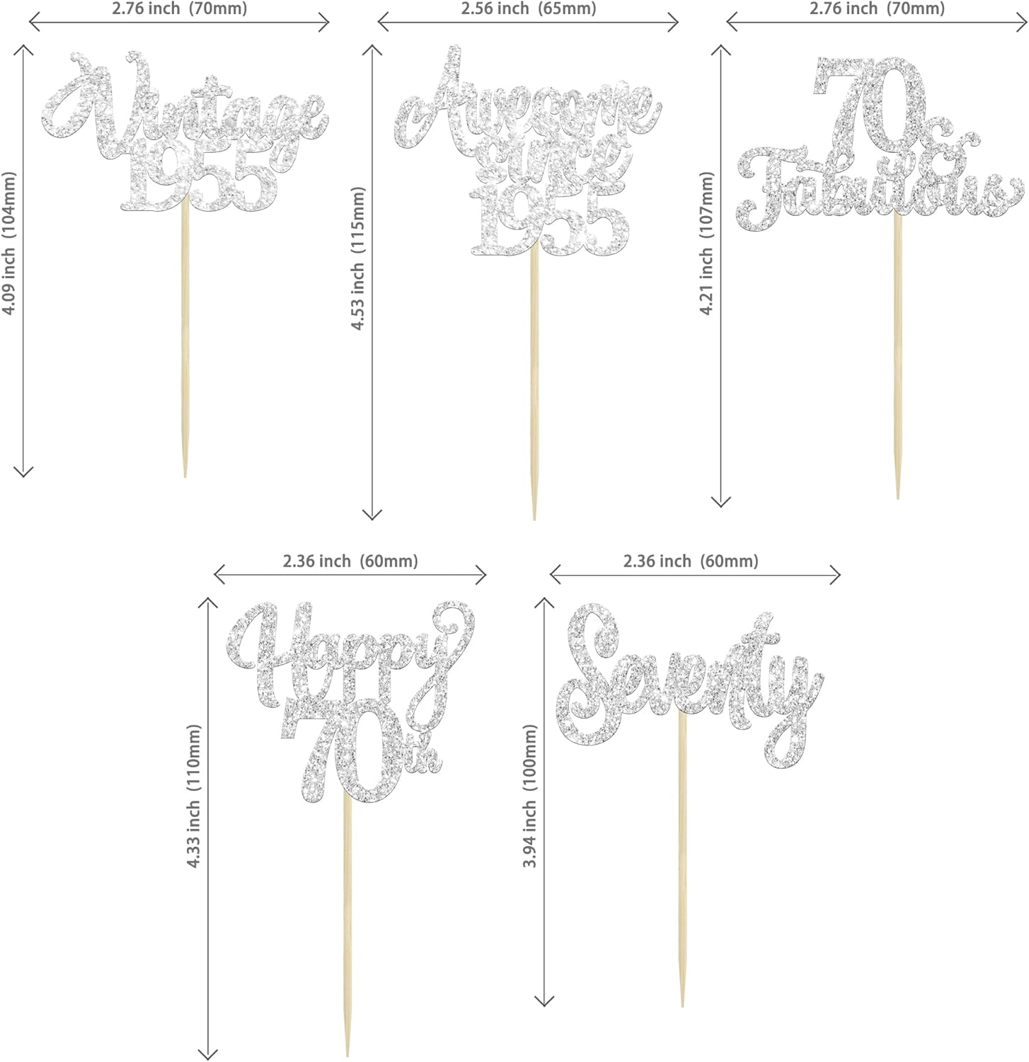 30Pcs Happy 70th Birthday Cupcake Toppers Glitter Seventy Vintage 1955 Cupcake Picks Cheers to 70 Fabulous Cake Decorations for 70th Birthday Wedding Anniversary Party Supplies Silver