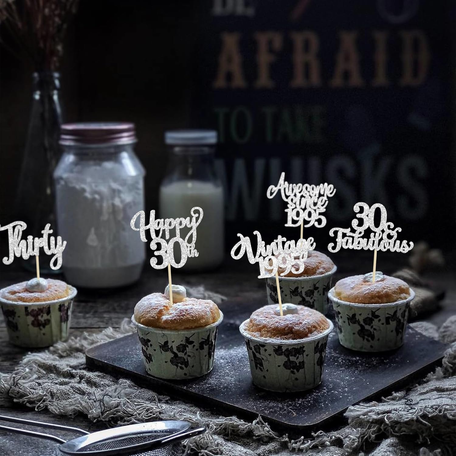 30Pcs Happy 30th Birthday Cupcake Toppers Glitter Thirty Vintage 1995 Cupcake Picks Cheers to 30 Fabulous Cake Decorations for 30th Birthday Wedding Anniversary Party Supplies Silver
