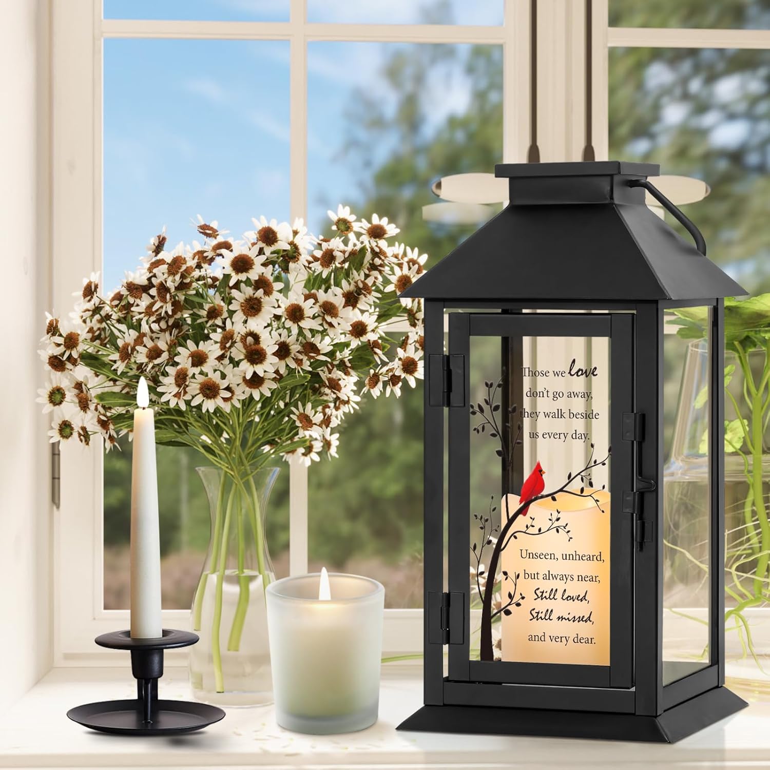- Sympathy Gift: Memorial lanterns are custom memorial gifts for loss loved ones that offer hope, comfort and help to a grieving friend or family member. Flickering flameless candle lights surround us like those we love never leave. Longer lasting than other gifts like flowers, place sympathy lanterns around home to remind you of precious memories. The cardinal pattern on the glass makes us feel that our loved ones are close by.