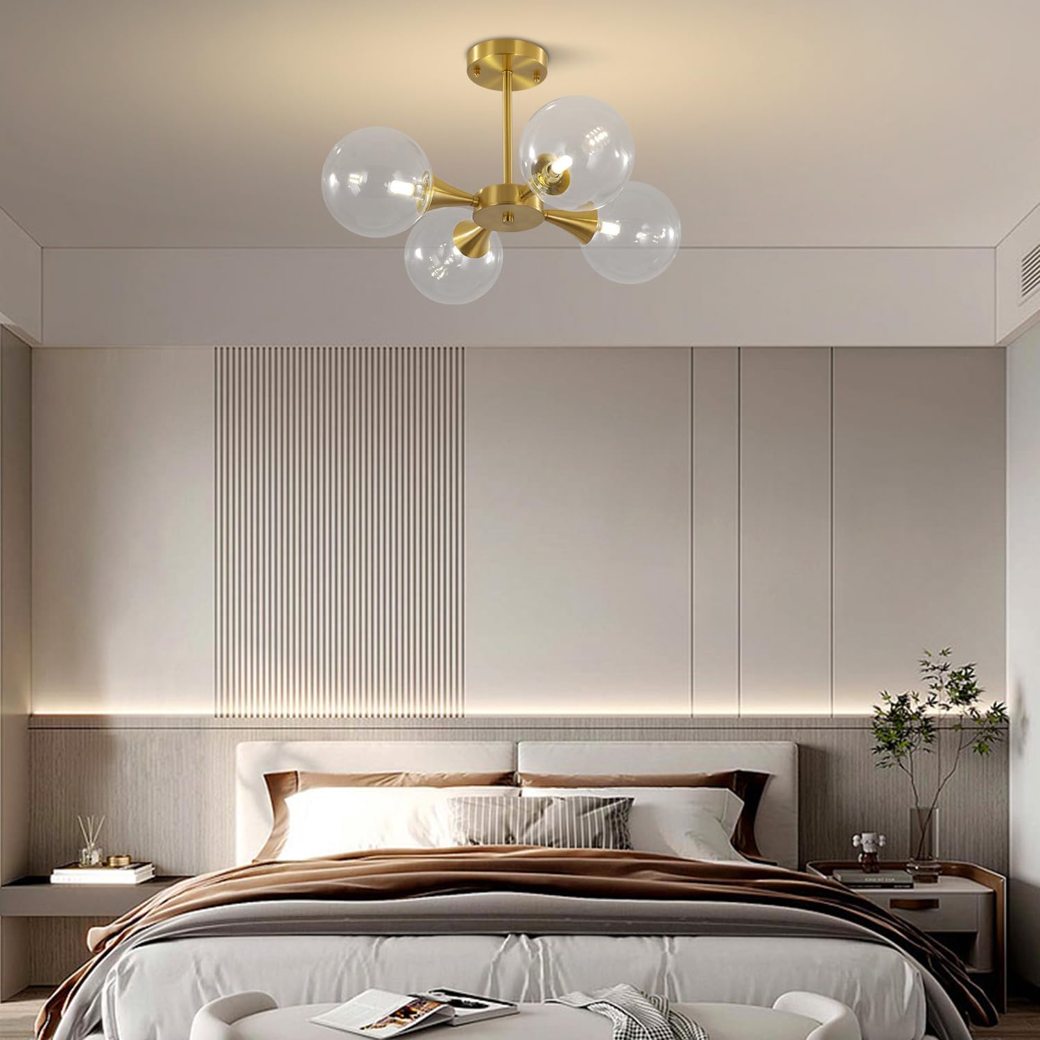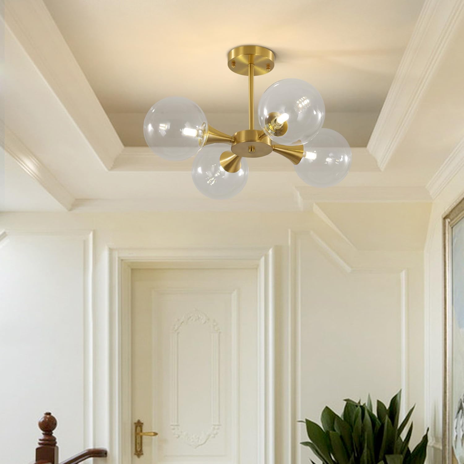 KCO Lighting 4-Lights Modern Globe Semi Flush Mount Ceiling Light Mid Century Brushed Brass Schoolhouse Close to Ceiling Light Gold Clear Glass Bubble Sputnik Chandelier Light Fixture