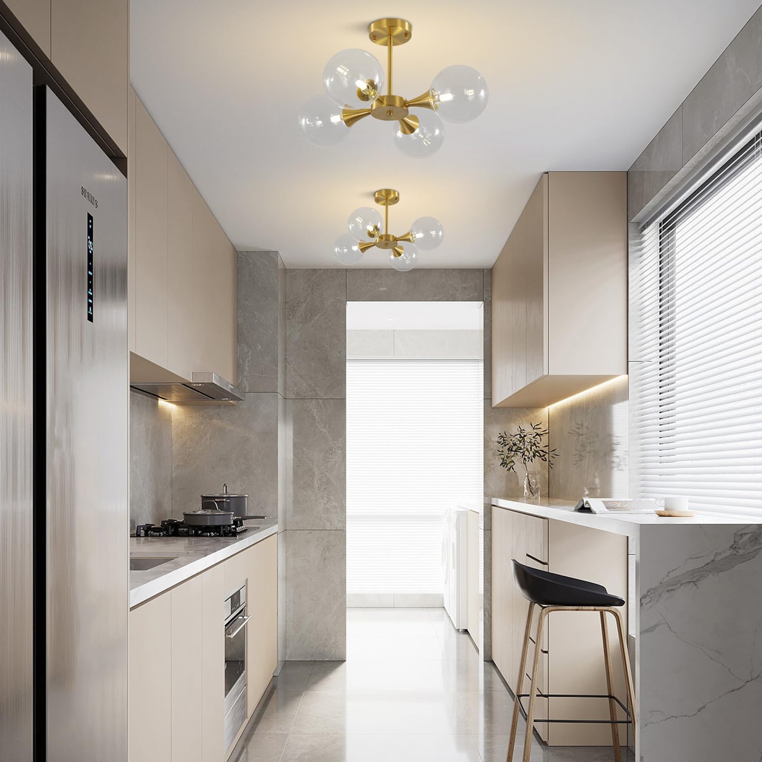 - Modern Gold Semi Flush Mount Ceiling Light: The clear flush mount clear light consists of 4 brushed brass metal branches, each with clear glass lampshade, provide comfortable and sufficient lighting in the room where it is placed. The brass gold hall ceiling light will creating mid-century modern style and simple look in your interior room