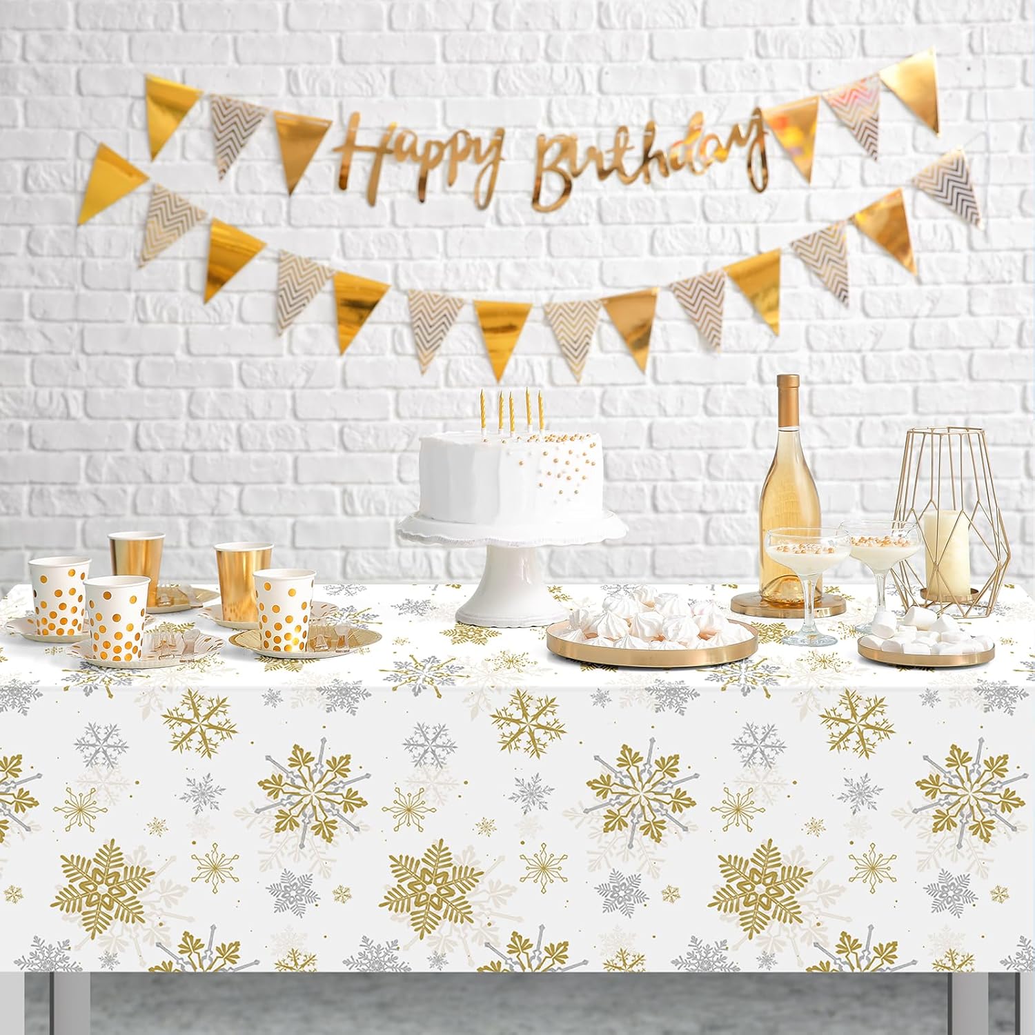 - What will you receive:3 pieces white and gold Christmas plastic party tablecloth,all over printed with gold and silver snowflake patterns on pure white backdrop,ideal for decorating your winter holiday and Christmas party supplies and decorations