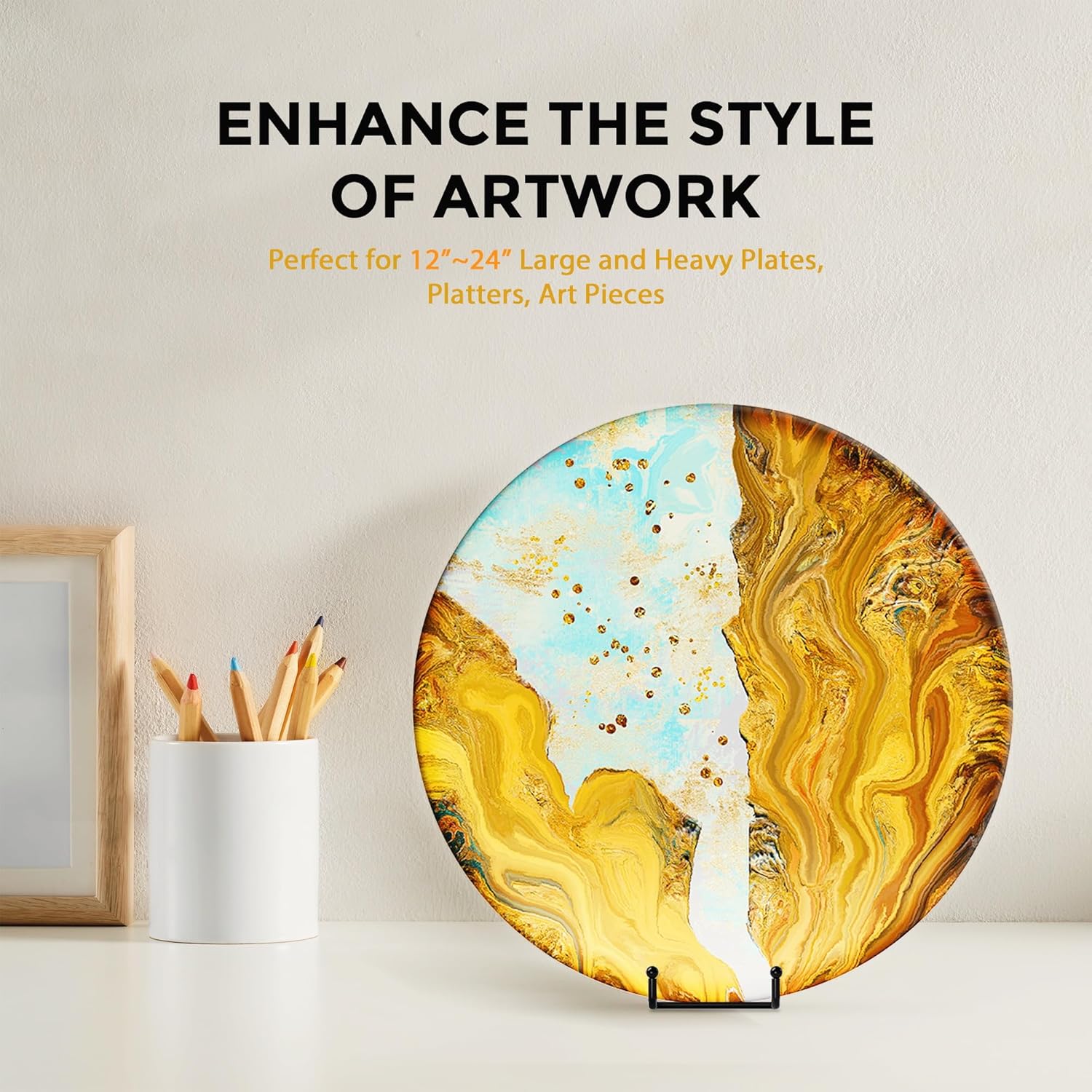 - STURDY DESIGN: - Made with wrought iron construction and a matte black powder-coated finish, this 12" plate display stands features a reliable 9.8" depth and 4" widened base design, capable of securely displaying a variety of large items such as decorative plates, platters, plaques, photo frames, trays, tiles, cutting boards, cookbook, sign, canvas art, and more.