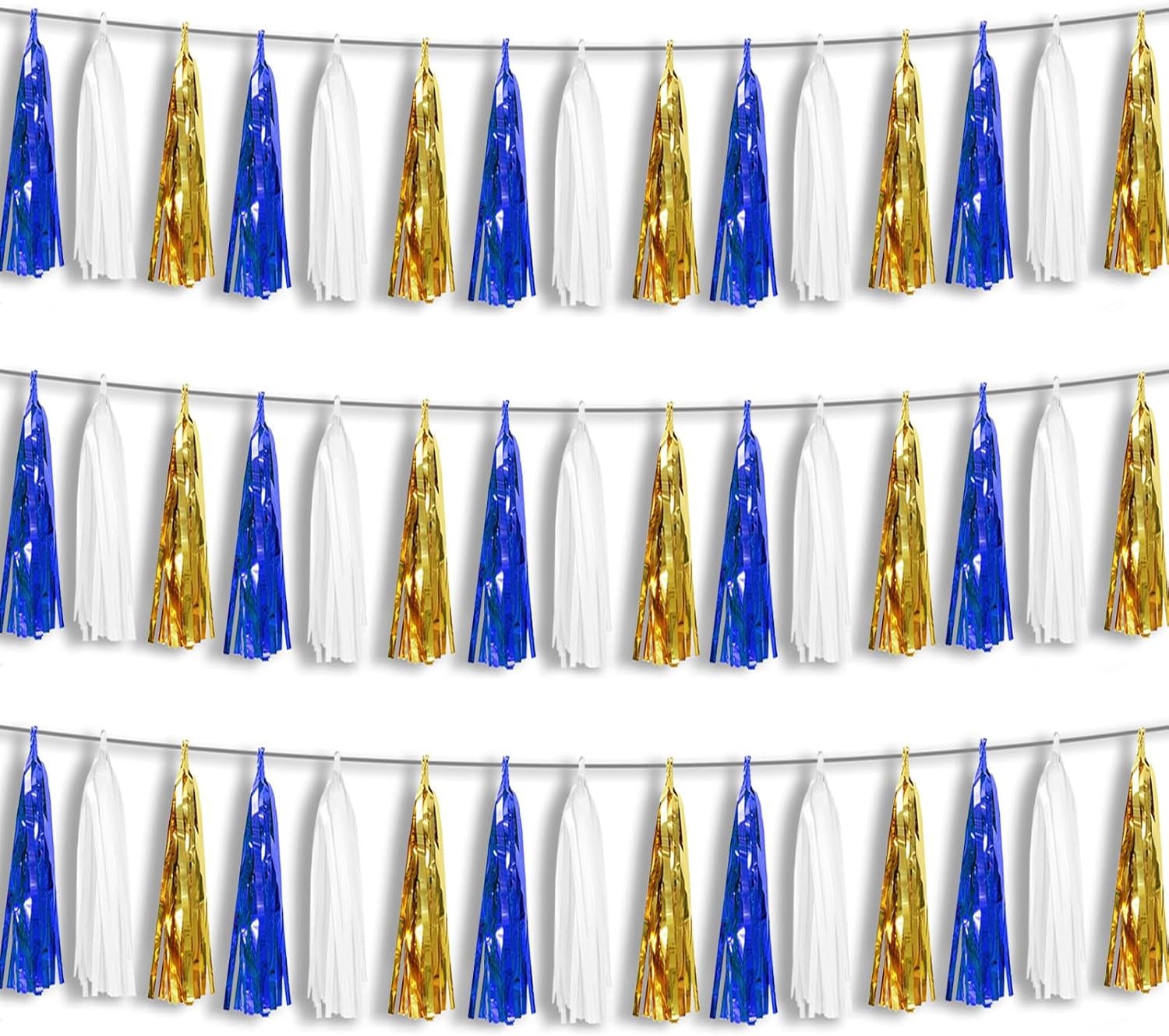 3P Navy-Blue White-Gold Foil Fringe Metallic Tassel-Garland, Tassels Banner Streamers for Parade Floats, Bachelorette, Wedding, Birthday, Halloween, Christmas, Bridal/Baby Shower Party Decorations