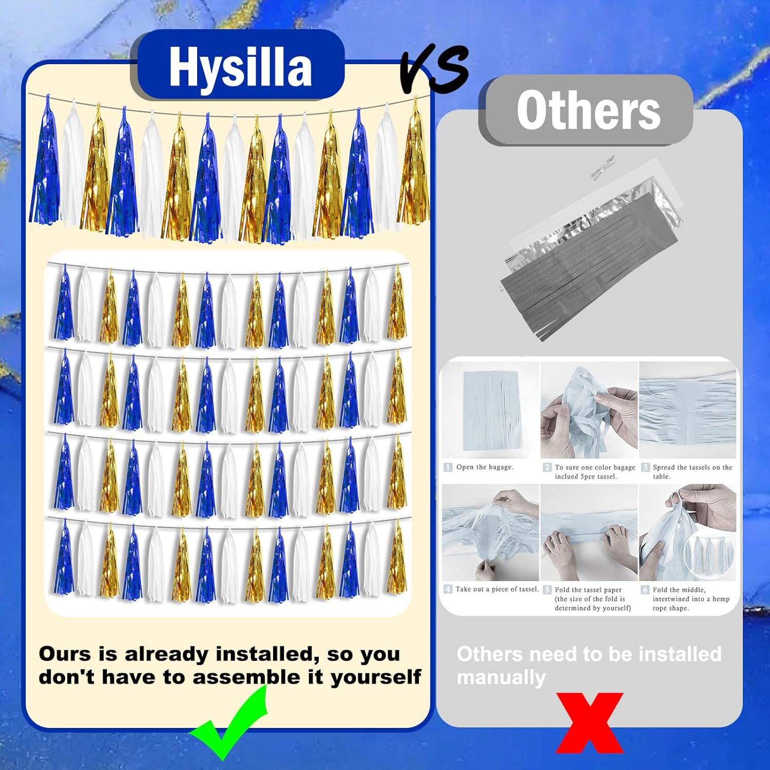 - 【Perfect Party Decoration】The navy blue white gold tinsel garlands are designed in a metallic Fringe, bright, and beautiful, at the same time, they shine in the sun, and these gorgeous tassel garlands create a wonderful backdrop or centerpiece for your party space. and bring you, your family, and your friend's good Visual effects. your party many emotional and touching moments where a lot of pictures will be taken and everybody will have a wonderful time together.