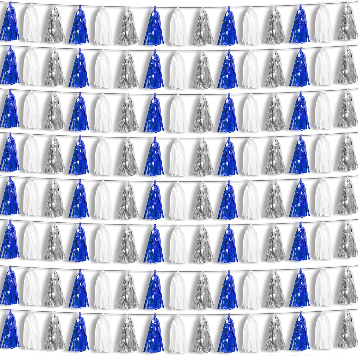 - 【Navy Blue White Silver Party Supplies Set】: The total length of the navy blue white silver birthday tassels banner is 78.7 feet 120tassels, divided into 8 strips, each 9.8 feet long. Each banner contains 15 tassels, and each tassel measures 14 inches, for birthday decorations many occasions, and so on