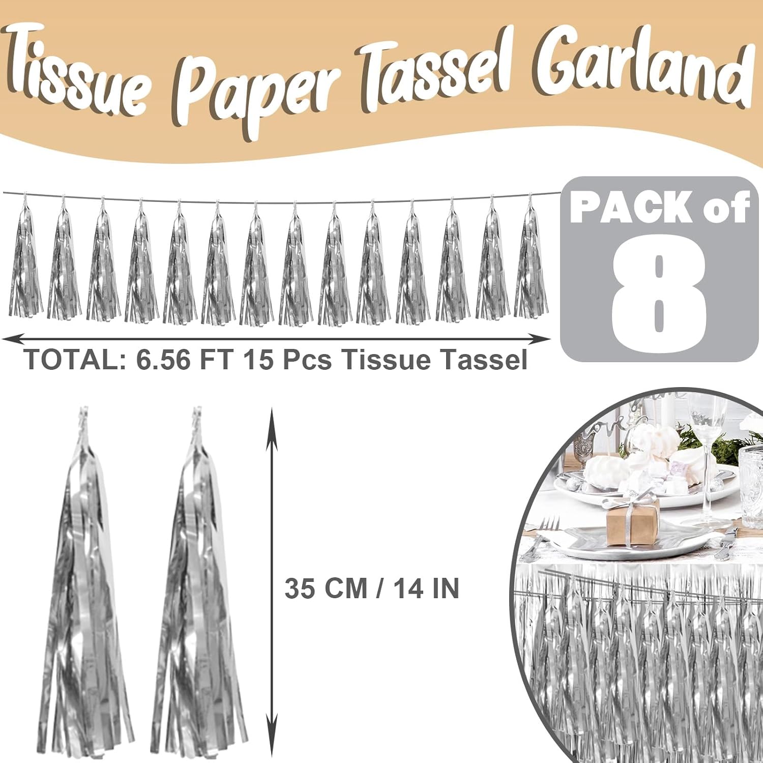 8P Silver Foil Fringe Metallic Tassel Streamers Banner Tassel Garland for Parade Floats, Bachelorette, Wedding, Birthday, Halloween, Christmas, Bridal/Baby Shower Party Decorations