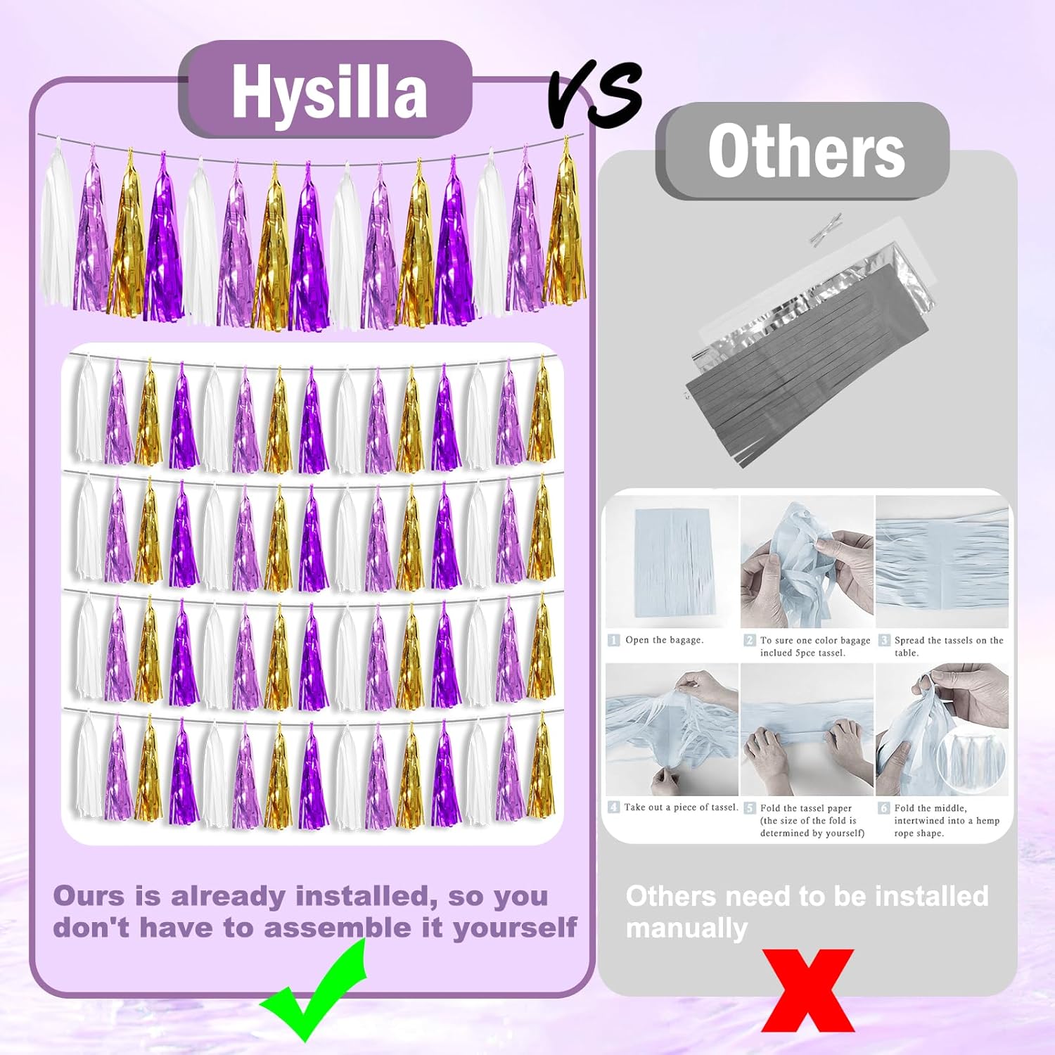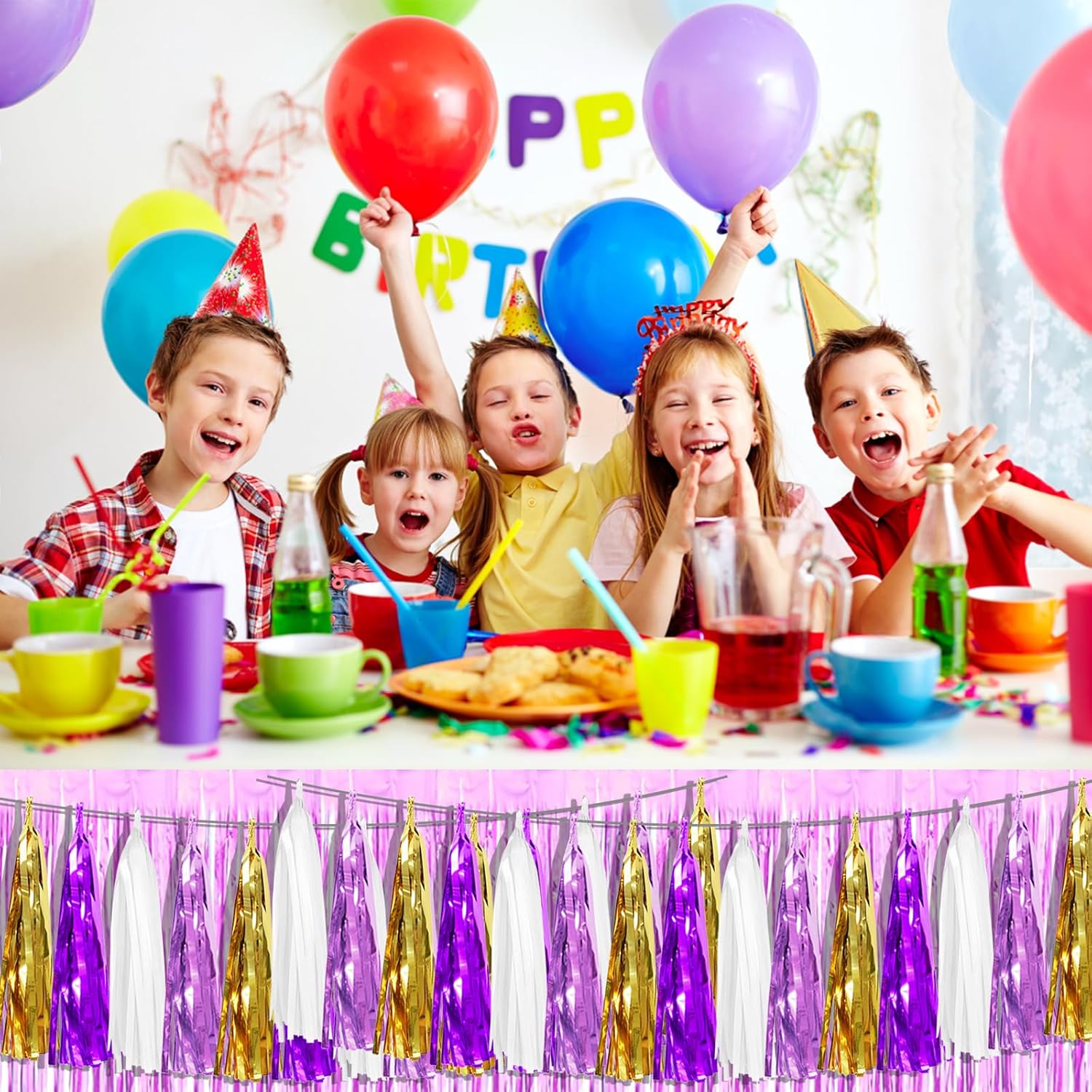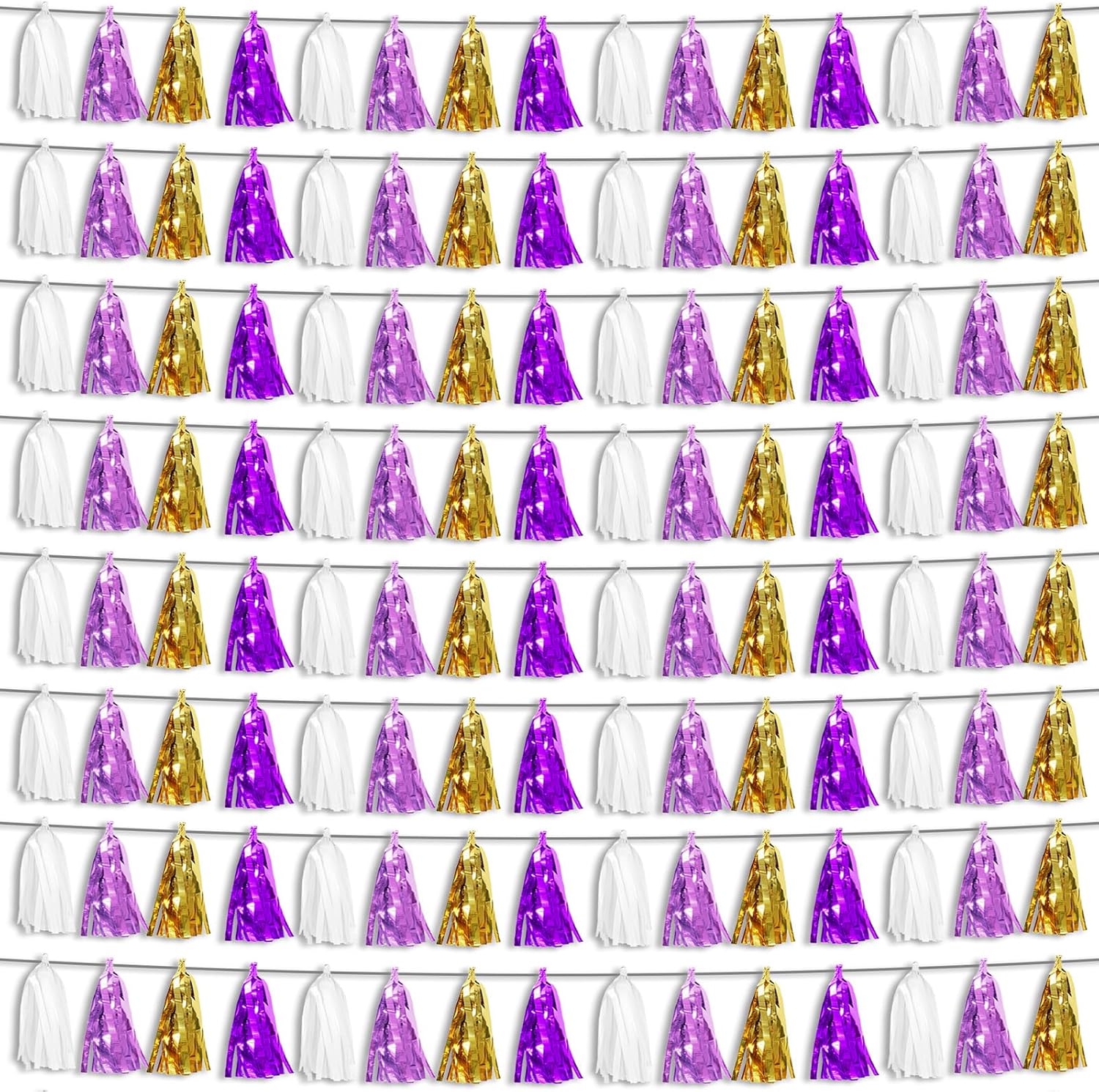 - 【White Light Purple Purple Gold Party Supplies Set】: The total length of the white light purple purple gold birthday tassels banner is 78.7 feet 120tassels, divided into 8 strips, each 9.8 feet long. Each banner contains 15 tassels, and each tassel measures 14 inches, for birthday decorations many occasions, and so on