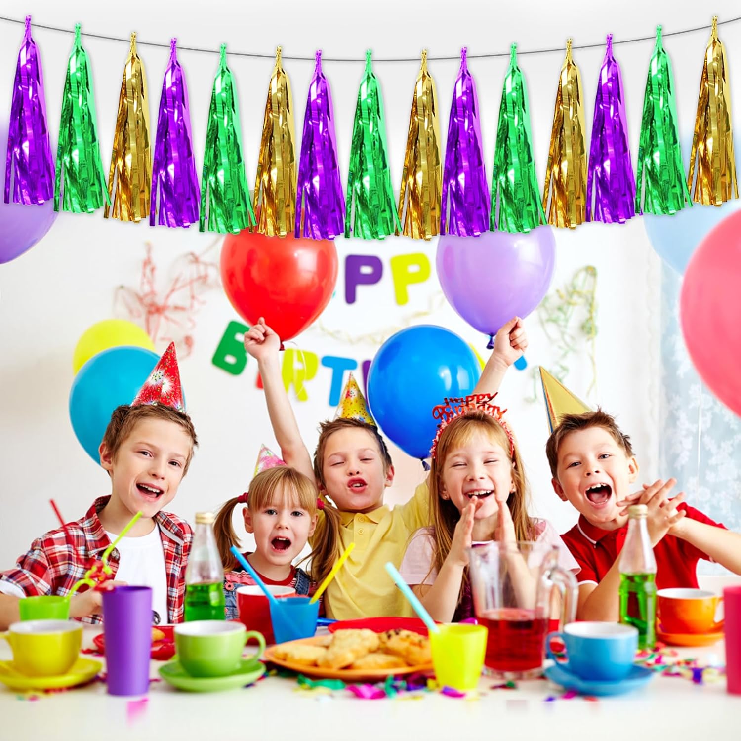 - 【Purple Green Gold Party Supplies Set】: The total length of the Purple Green Gold birthday tassels banner is 29.5 feet 45tassels, divided into 3 strips, each 9.8 feet long. Each banner contains 15 tassels, and each tassel measures 14 inches, for birthday decorations many occasions, and so on