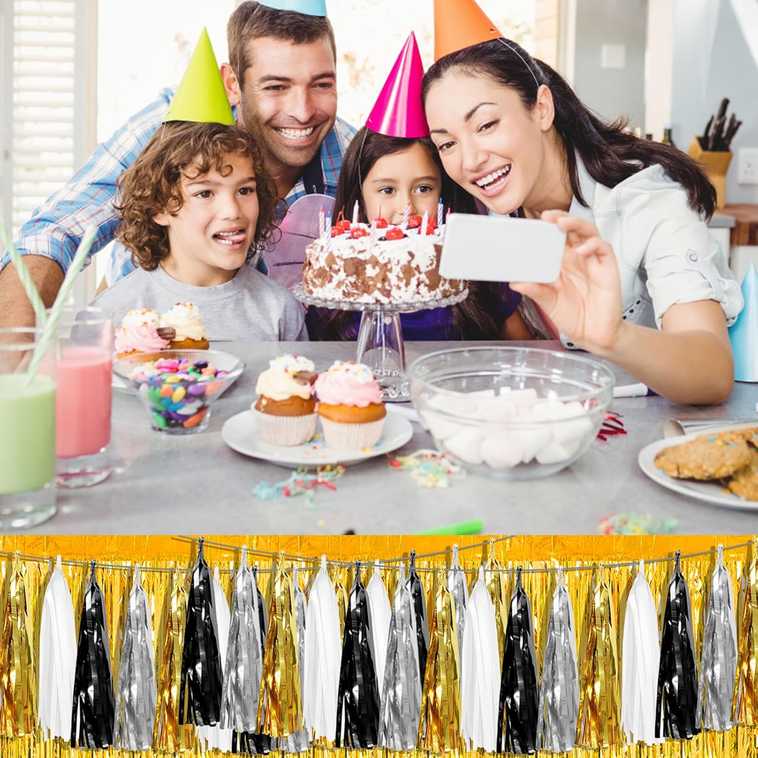 8P Black Gold Silver Foil Fringe Metallic Tassel Garland, Tassels Banner Streamers for Parade Floats, Bachelorette, Wedding, Birthday, Halloween, Christmas, Bridal/Baby Shower Party Decorations