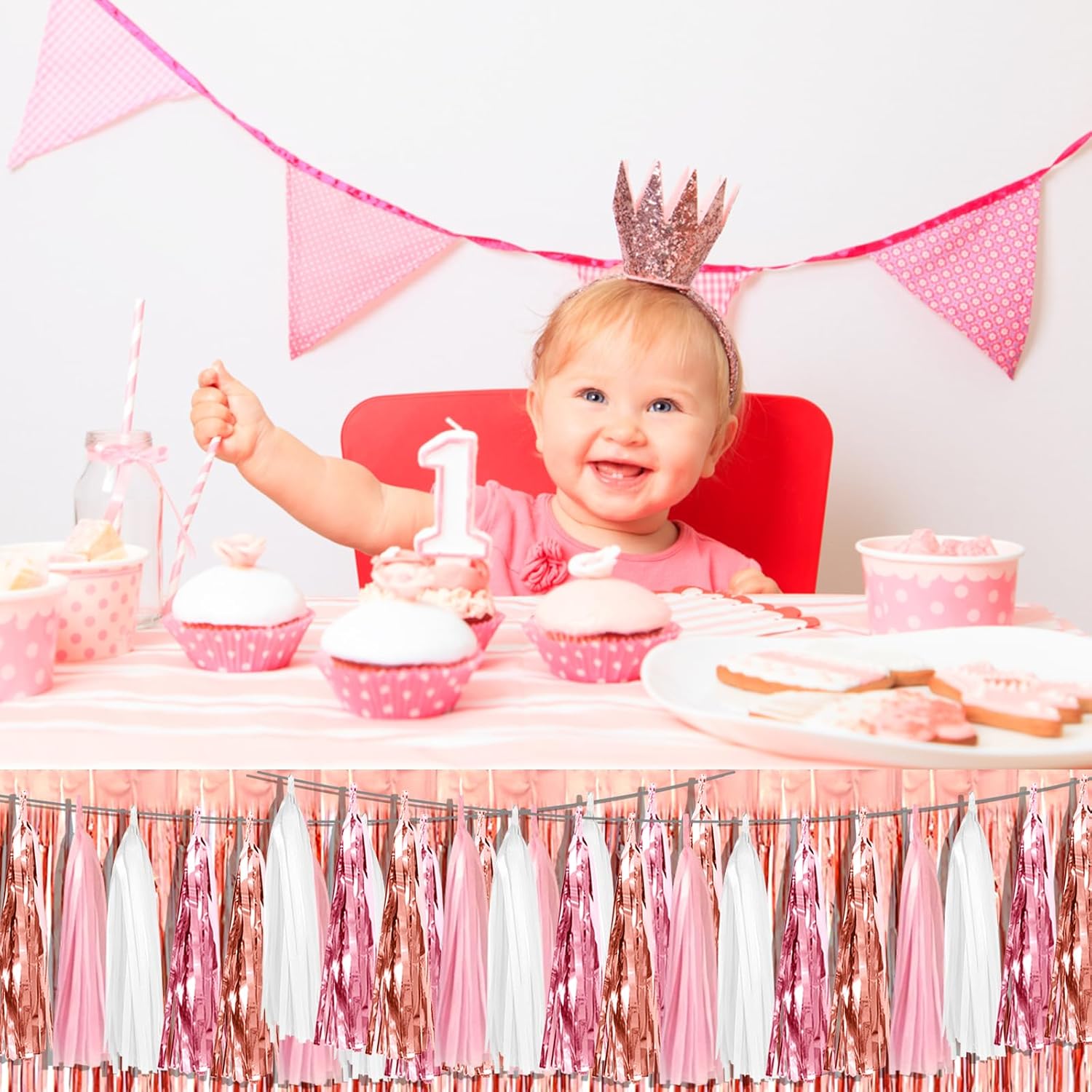 - 【Pink White Peach Rose Gold Party Supplies Set】: The total length of the pink white peach rose gold birthday tassels banner is 78.7 feet 120tassels, divided into 8 strips, each 9.8 feet long. Each banner contains 15 tassels, and each tassel measures 14 inches, for birthday decorations many occasions, and so on