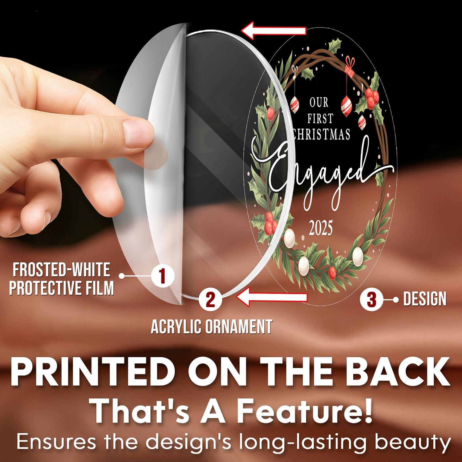 - ACRYLIC MATERIAL: Made from acrylic with a transparent protective film on the front to prevent scratches. The design is printed on the back, and to fully appreciate the ornament's beauty, remove the protective film to reveal the clear acrylic finish