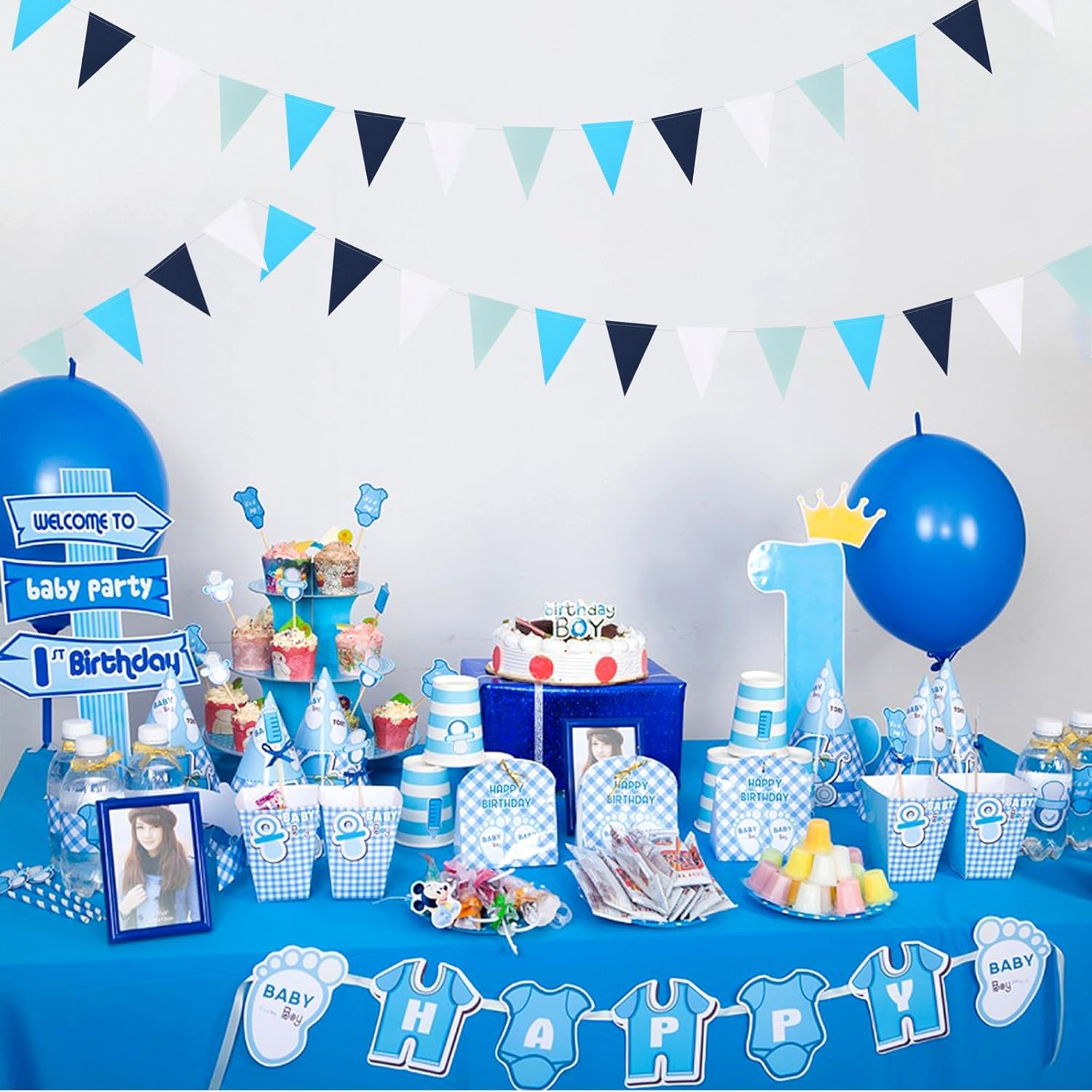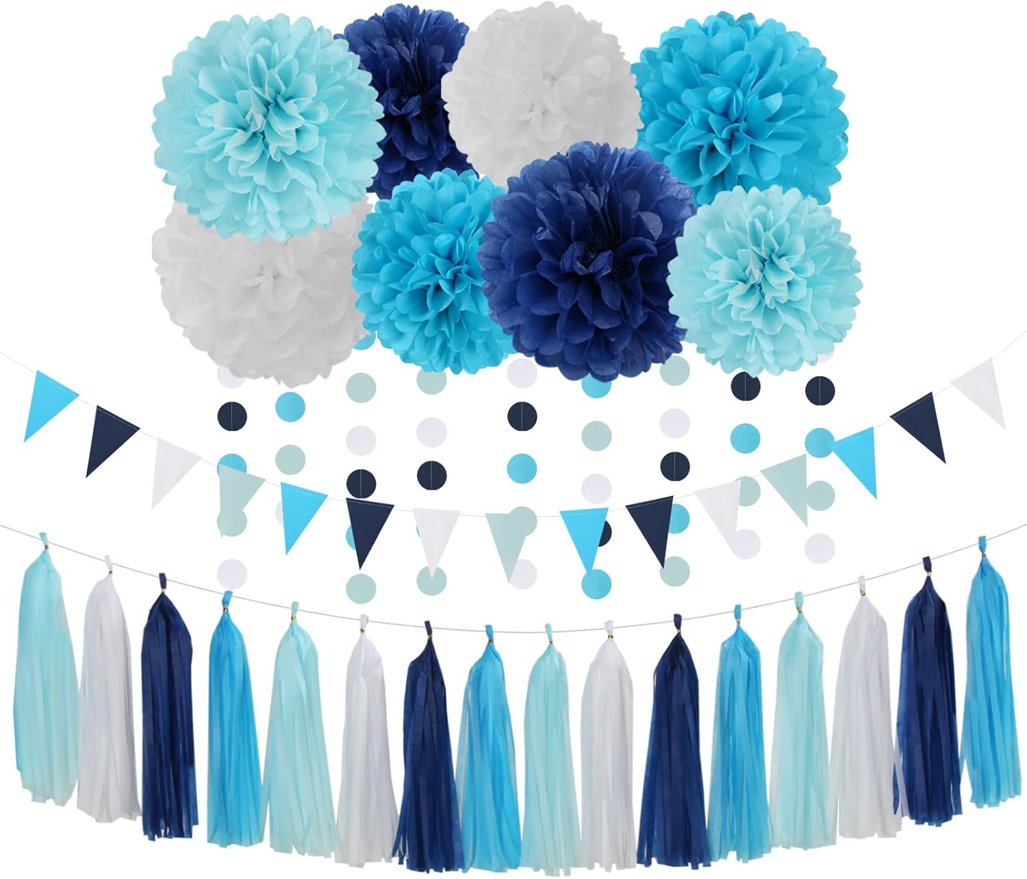 - 【Light-Royal Navy-Blue White Party Kits】The party decorations kits include 8pcs tissue paper flowers: 4pcs 8" and 4pcs 10" in Blue color, 1pcs Triangle Flags,1pcs circle dots paper garland,20pcs tassel garland. Total30pcs.