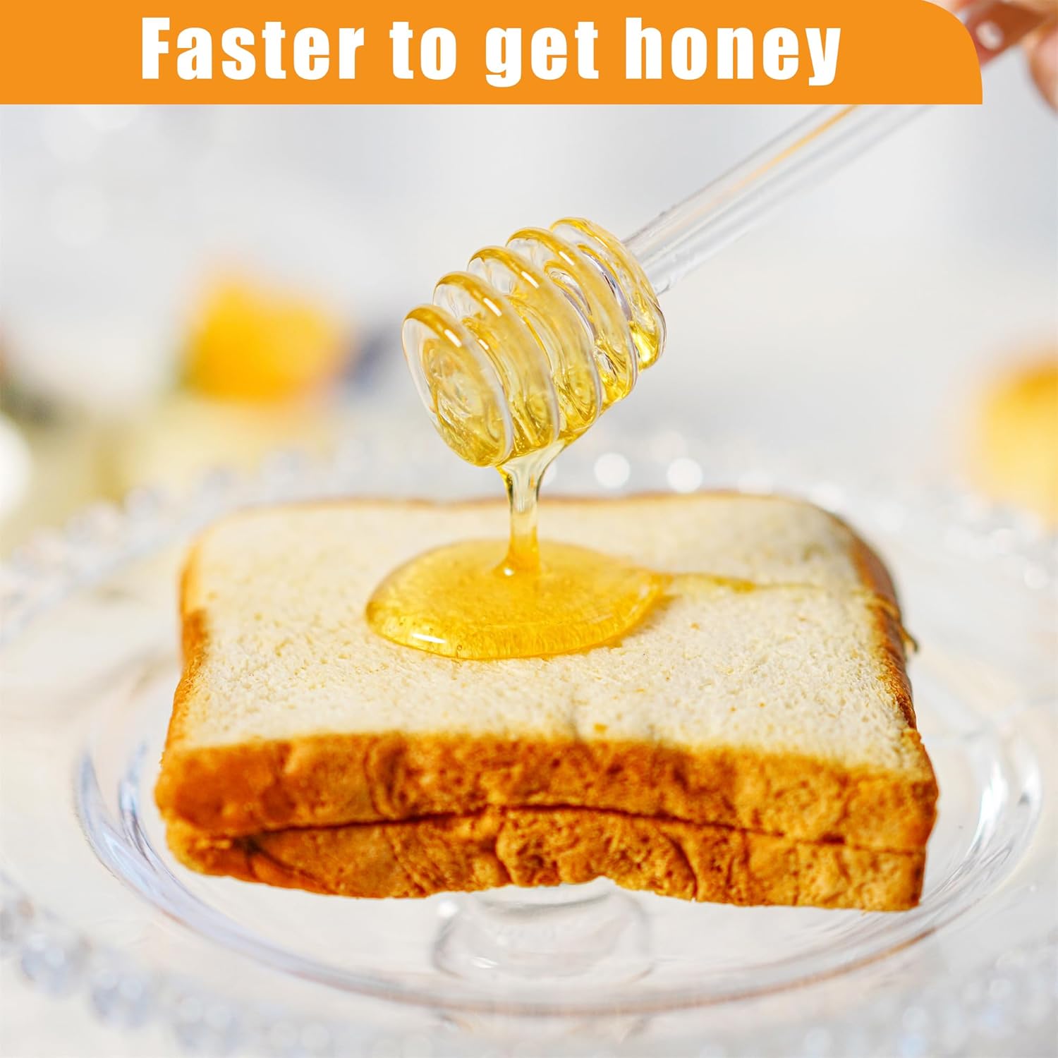 - Stylish Design: The sleek glass design adds a touch of elegance to your kitchen or dining table, making it a beautiful addition to any setting.The wide mouth design allows the honey spoon to easily capture honey in its grooves and twirl it without dribbling down