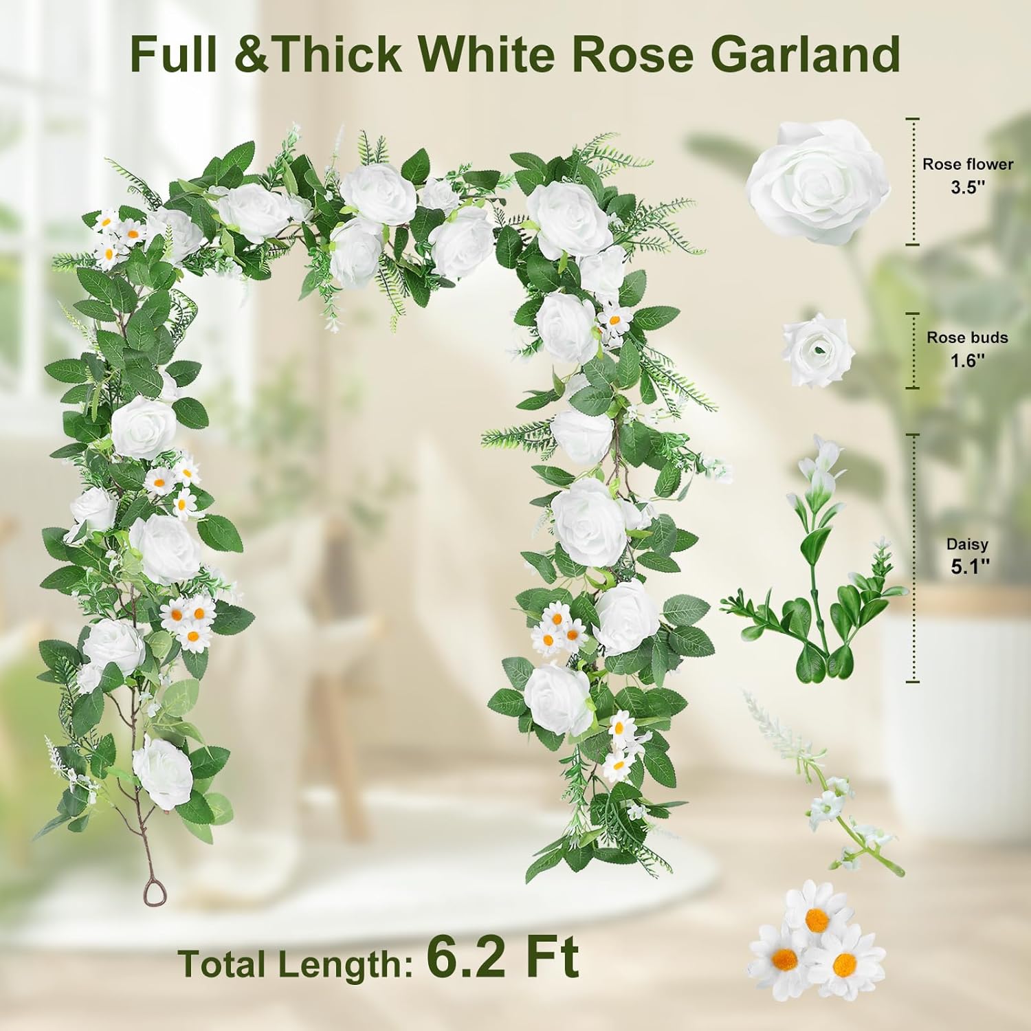 - [🌼Pretty White Flower Garland]: This rose garland is made up of richly sized 14 rose flowers and 8 buds, daisy, plentiful kinds of leaves. The white flowers and buds feature a stunning array of bright, elegant and holy; The rose vine leaves are full of luster, clear veins. The garland shape is very natural, vibrant and looks close to real. It adds a lively and dazzling spring touch to the season's decorations. A natural and realistic accent that radiates warmth and full of vigor.