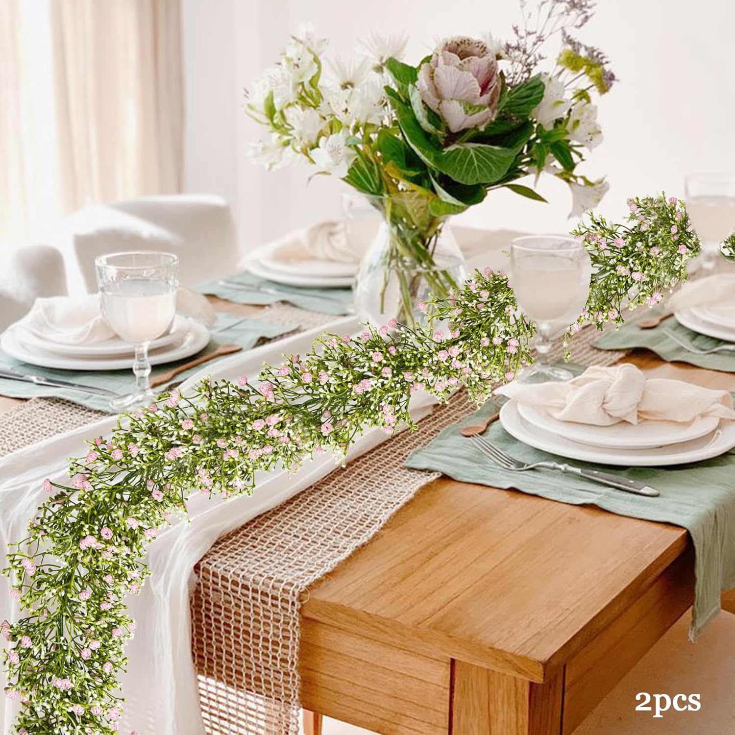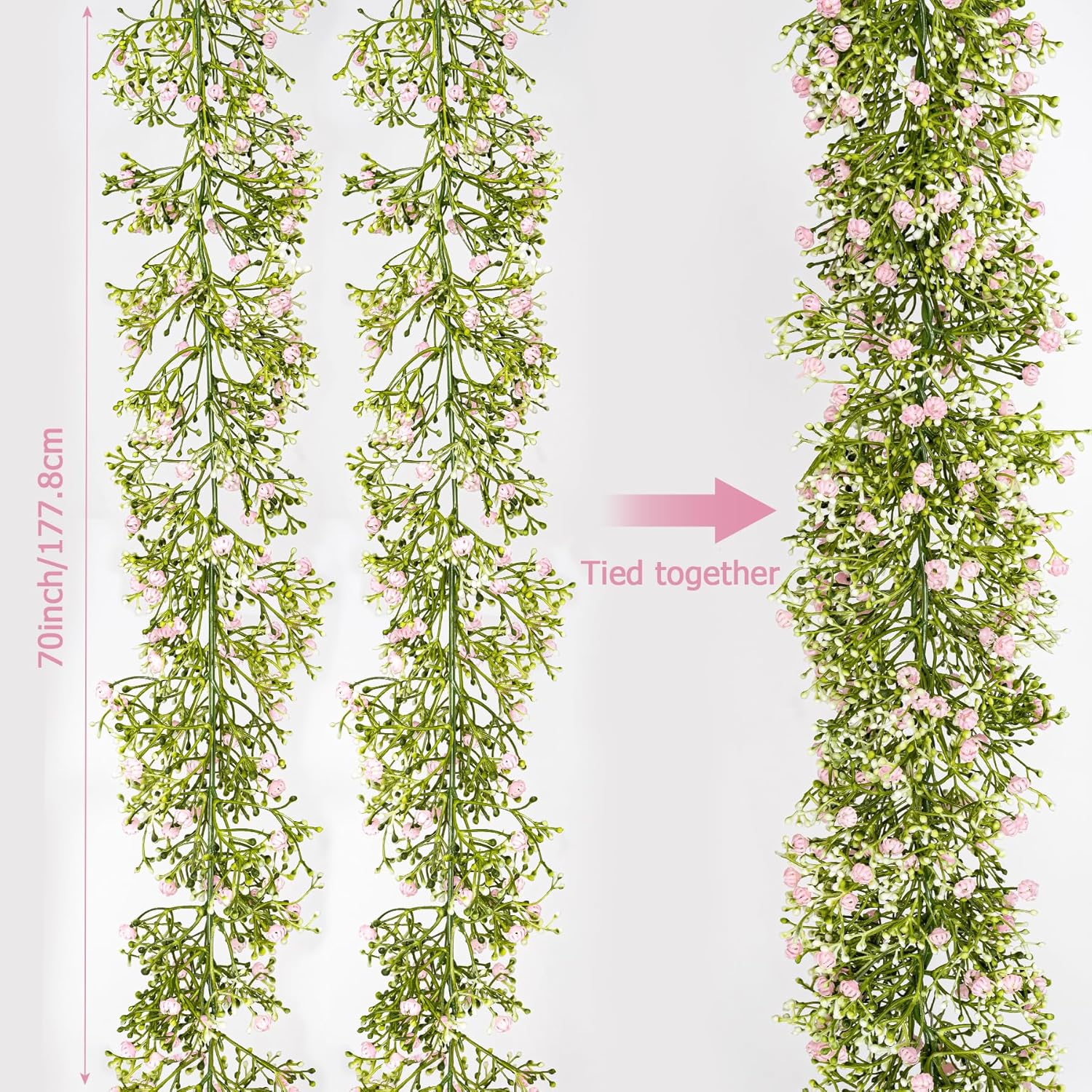 - 【ABUNDANT QUANTITY】:There are two baby's breath vines in each package. Each vine is 70 inches in length and 4.33 inches in width. With a large number of flowers and a long vine length, you can freely decorate. Whether it is hung on the wall, wrapped around the railing or used for table decoration, it can show a unique effect.