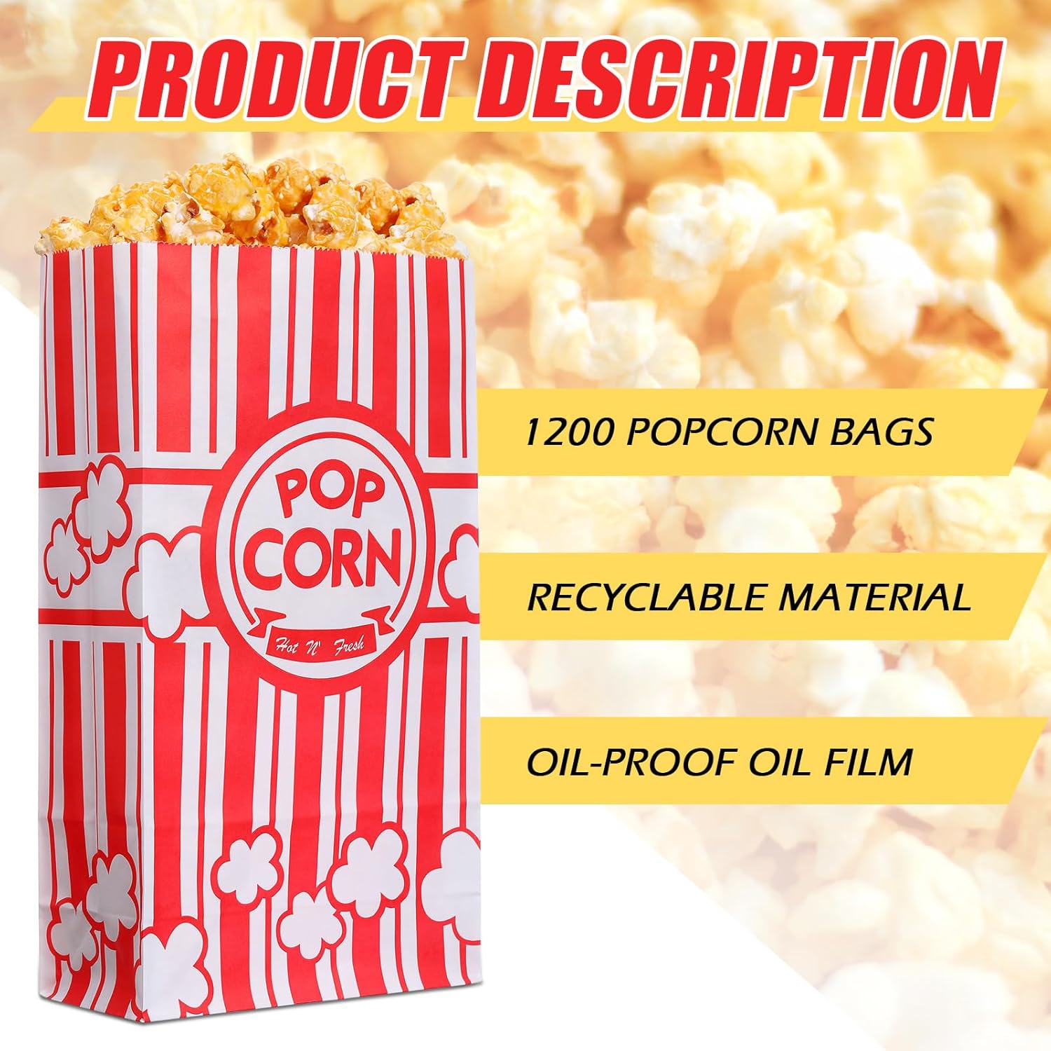 - Sufficient Popcorn Bags for Lasting Service: the package comes with 1200 pieces of movie theater popcorn bags, with a capacity of approx. 2oz and a size of approx. 23 x 13 x 6 cm/ 9.06 x 5.12 x 2.36 inches, enough to satisfy your demands in daily life