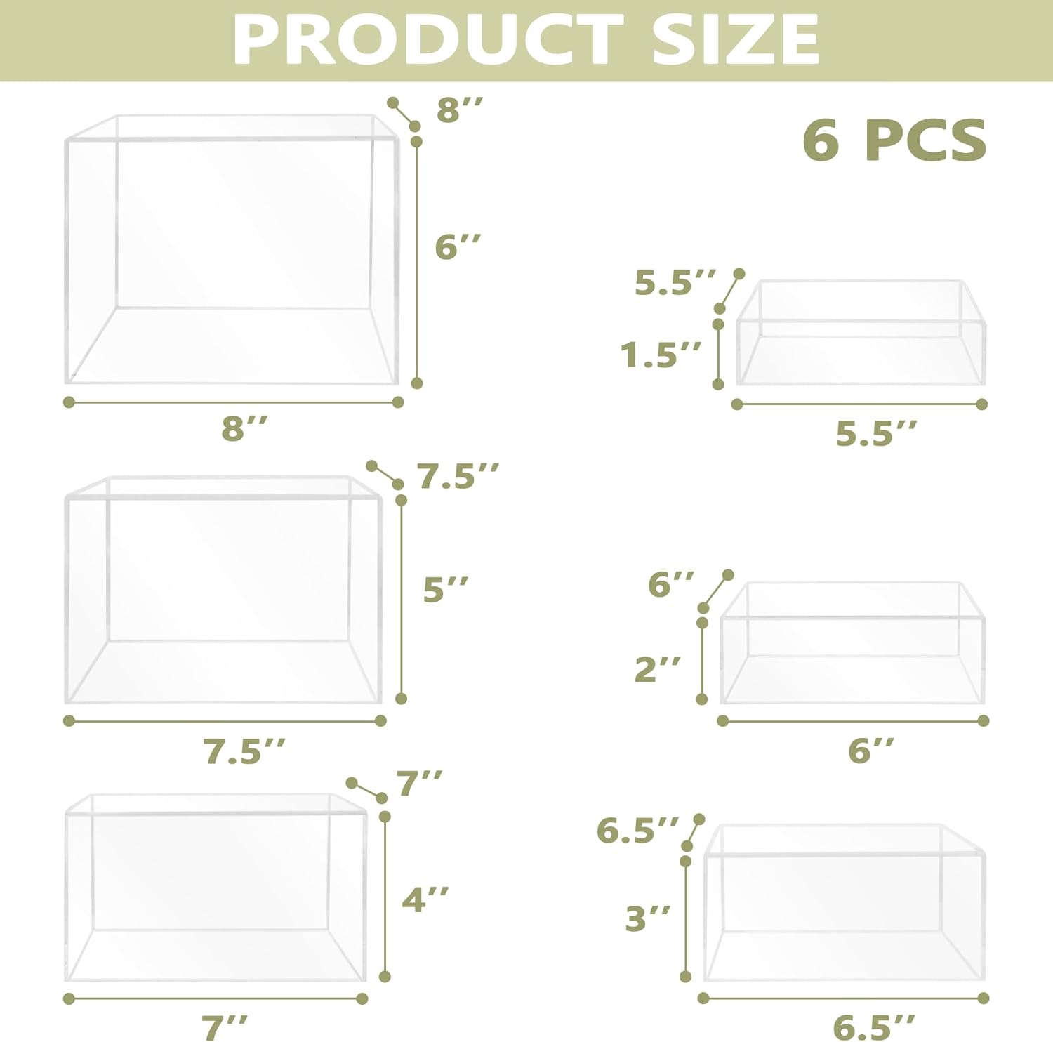 - 6 Various Sizes: Please check measurements in pic3 before purchasing. Our array of acrylic display boxes offers versatility and practicality, available in six distinct sizes:5.5",6",6.5",7",7.5",8". these boxes are designed for nesting and stacking, providing a convenient solution for organizing and showcasing a variety of items.(Please carefully check detail sizes in pictures 3 before you purchase)