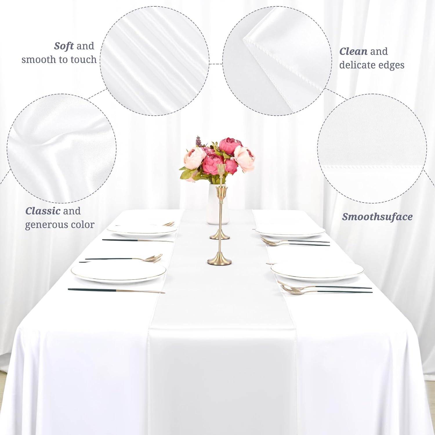 - đ·ăPerfect FinishăSatin table runner is made of delicate satin with smooth appearence.Neat seams with a clean look.Seamless, wrinkle-free, lightweight.Our satin table runners feature a refined, a solid color with an exquisite satin sheen that creates simple elegance.The seamless one-piece design making your party decorations shine when you add this silky-smooth runner on your table top.It's a great way to make your centerpieces and candles pop!
