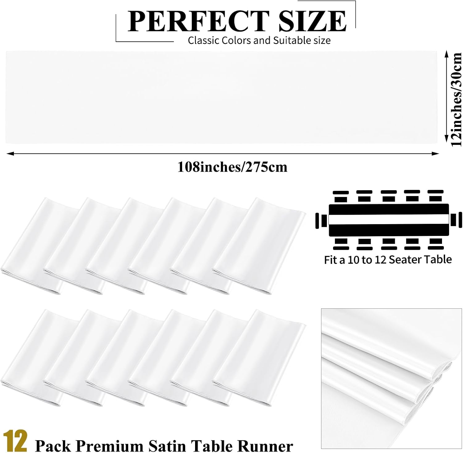 - đ·ăSet includesă12 Pack white satin table runner measures 12" x 108" in size, appropriate for a table that can seat 8-10 people. This satin table runner can fit a 6ft/8ft rectangular table or round table well.This satin table runner is great for event table decorations.Our satin table runner make your dining table more dazzling and outstanding.Purchase our 12piece satin table runner and save even more.