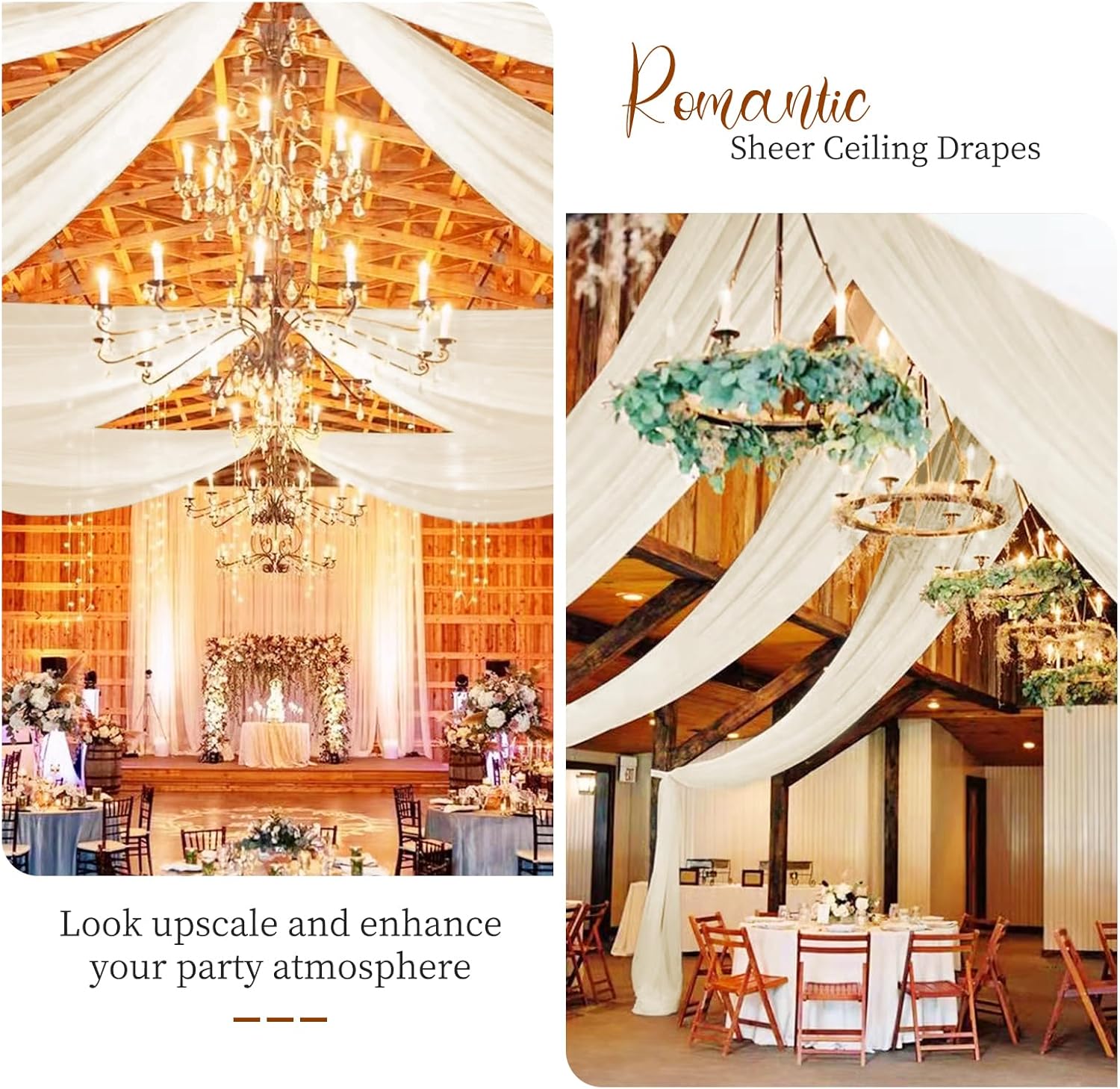 - 🍸Reliable Material: The wedding ceiling drapes are made of chiffon, which is light, soft, hard to wrinkle with a strong drape, easy to create a romantic effect; and these ivory ceiling drapes will create a delicate and aesthetic sense to your wedding ceiling decoration and light up every banquet. The elegant ivory color makes them to be a charming decoration that will appeal to every guest. You can DIY them to decorate your party as your inclination.