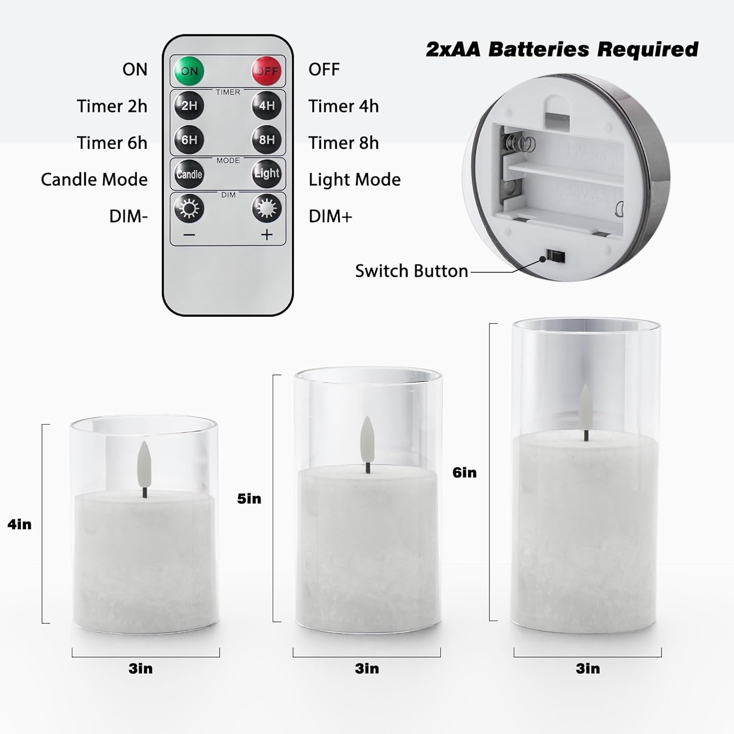 - 【White Flameless Candles】When these realistic flameless candles flickering, the light of the 3D wick is warm white, the bright candlelight passes through the clear glass, reflecting beautiful light and shadow, showing a cozy atmosphere, which is very suitable as a Mother's Day gift, birthday gift, and Valentine's gift. - Set of 3 with the size of 3'' in diameter, 4''/5''/6'' in tall.