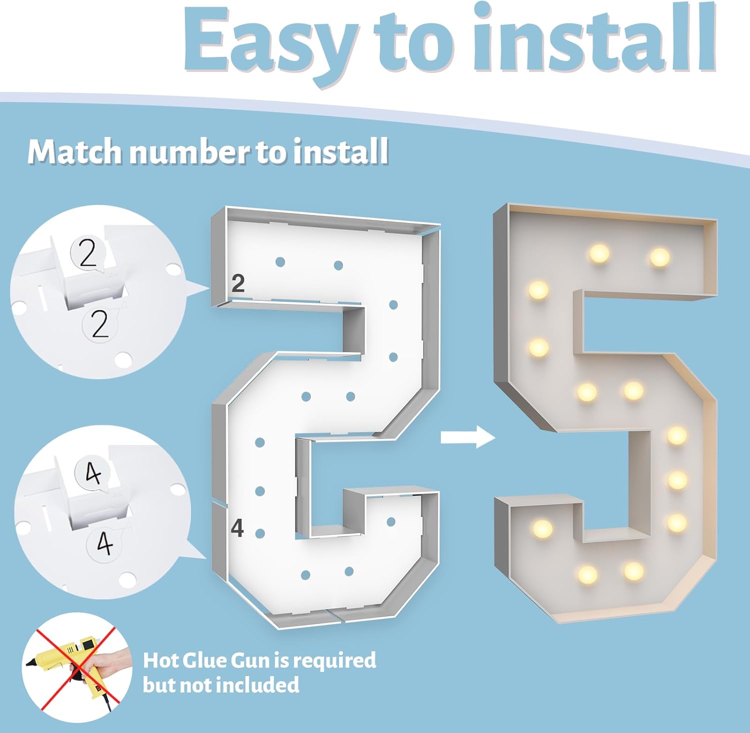 - ASSEMBLY REQUIRED: The marquee numbers need to be assembly with hot glue gun(not included in the package) Assemble it in advance will make your party amazing and fantastic
