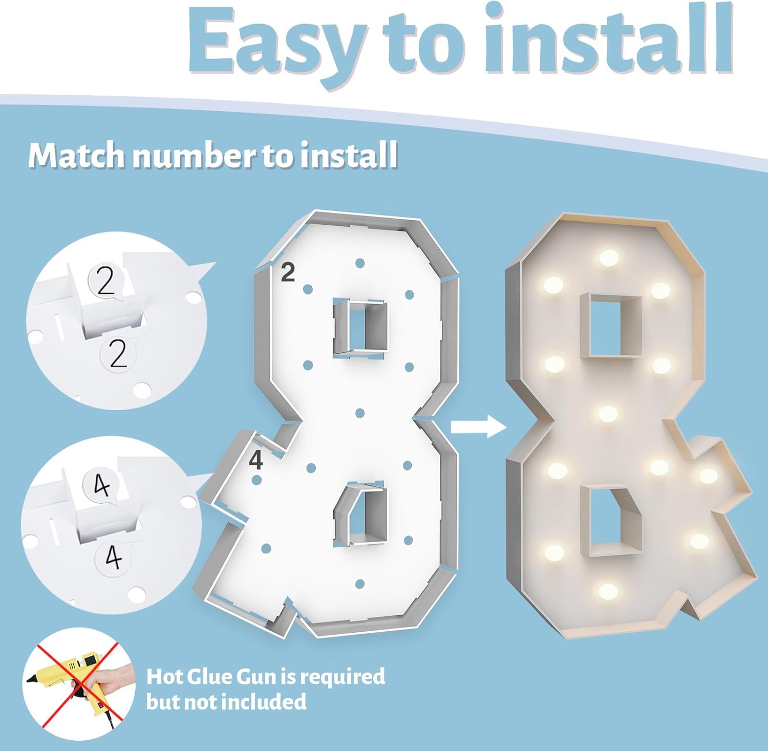 - ASSEMBLY REQUIRED: The marquee numbers need to be assembly with hot glue gun(not included in the package) Assemble it in advance will make your party amazing and fantastic