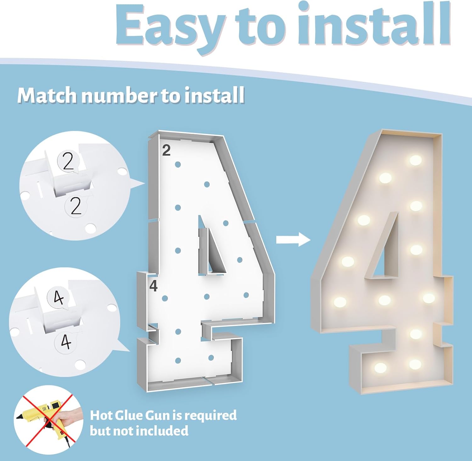 - ASSEMBLY REQUIRED: The marquee numbers need to be assembly with hot glue gun(not included in the package) Assemble it in advance will make your party amazing and fantastic