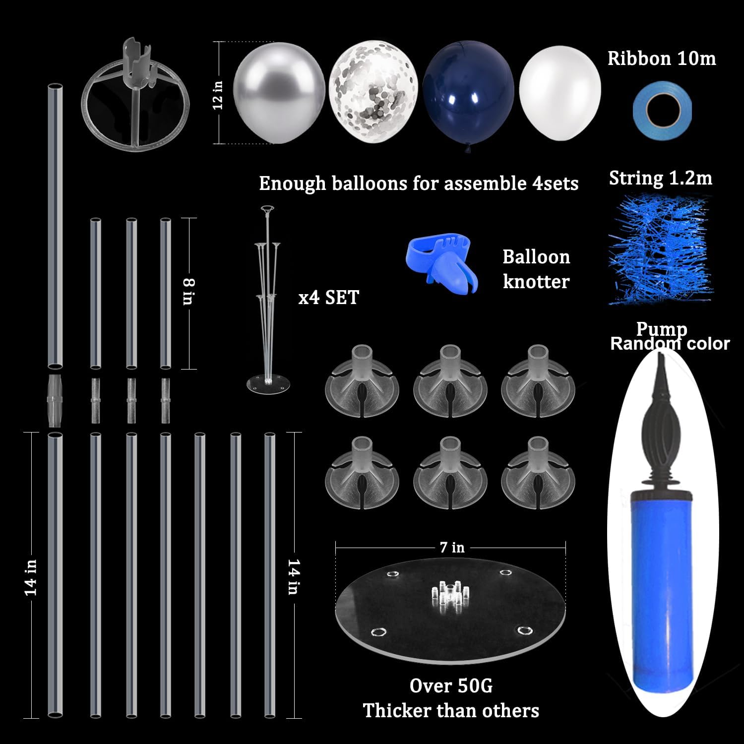 - WHAT INLCUDE: This balloon stand kit include 4 set balloon holders, 35pcs balloons - navy blue balloons, white balloons, silver and confetti balloons, balloon pump,ribbons, glue dots and tie tool