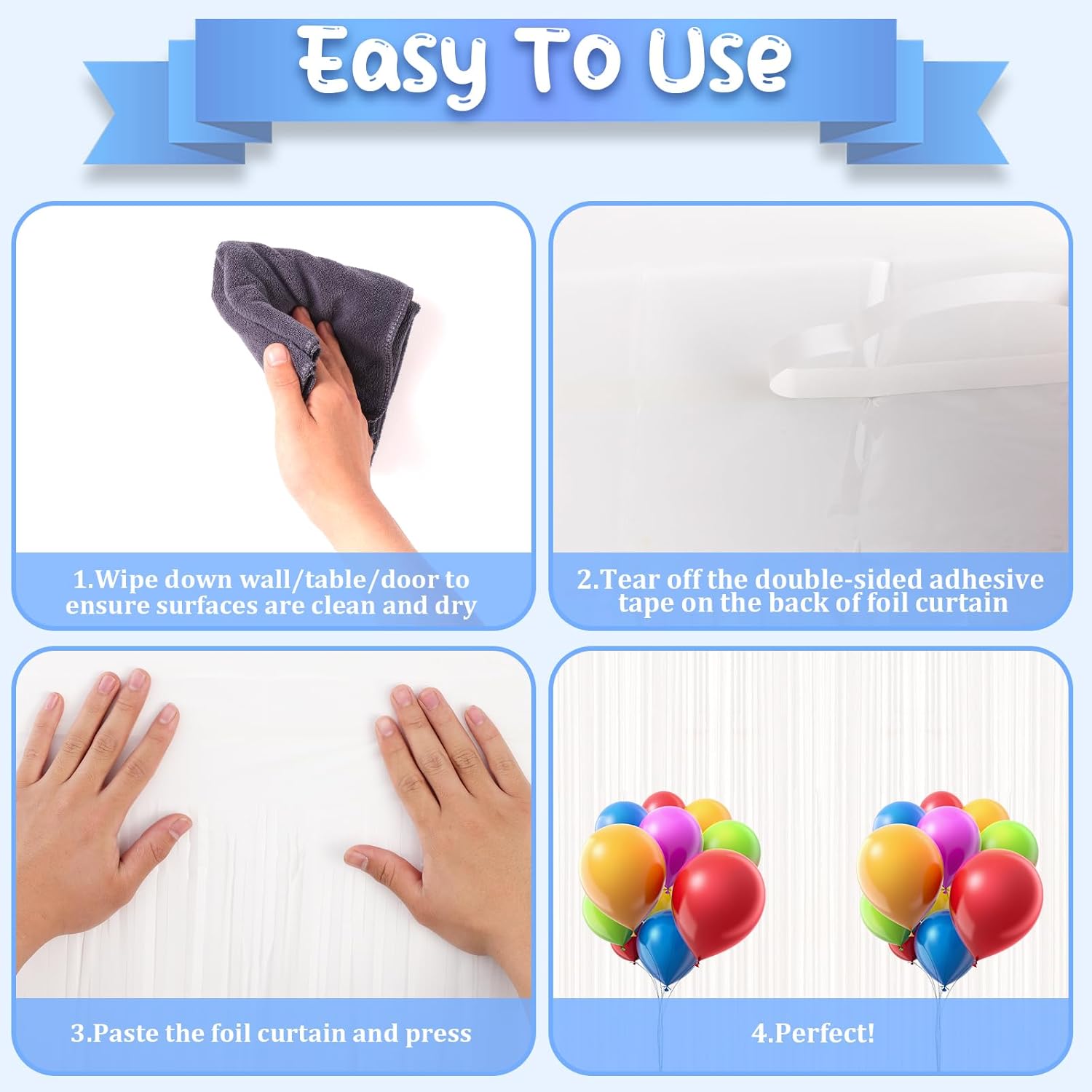 - Package Included: 2 packs of foil fringe curtains, the size of the foil curtain is 3.3*8.2 ft. It's long enough to fit any occasion. Please do not stick the foil curtain on uneven or stained walls to prevent it from falling off