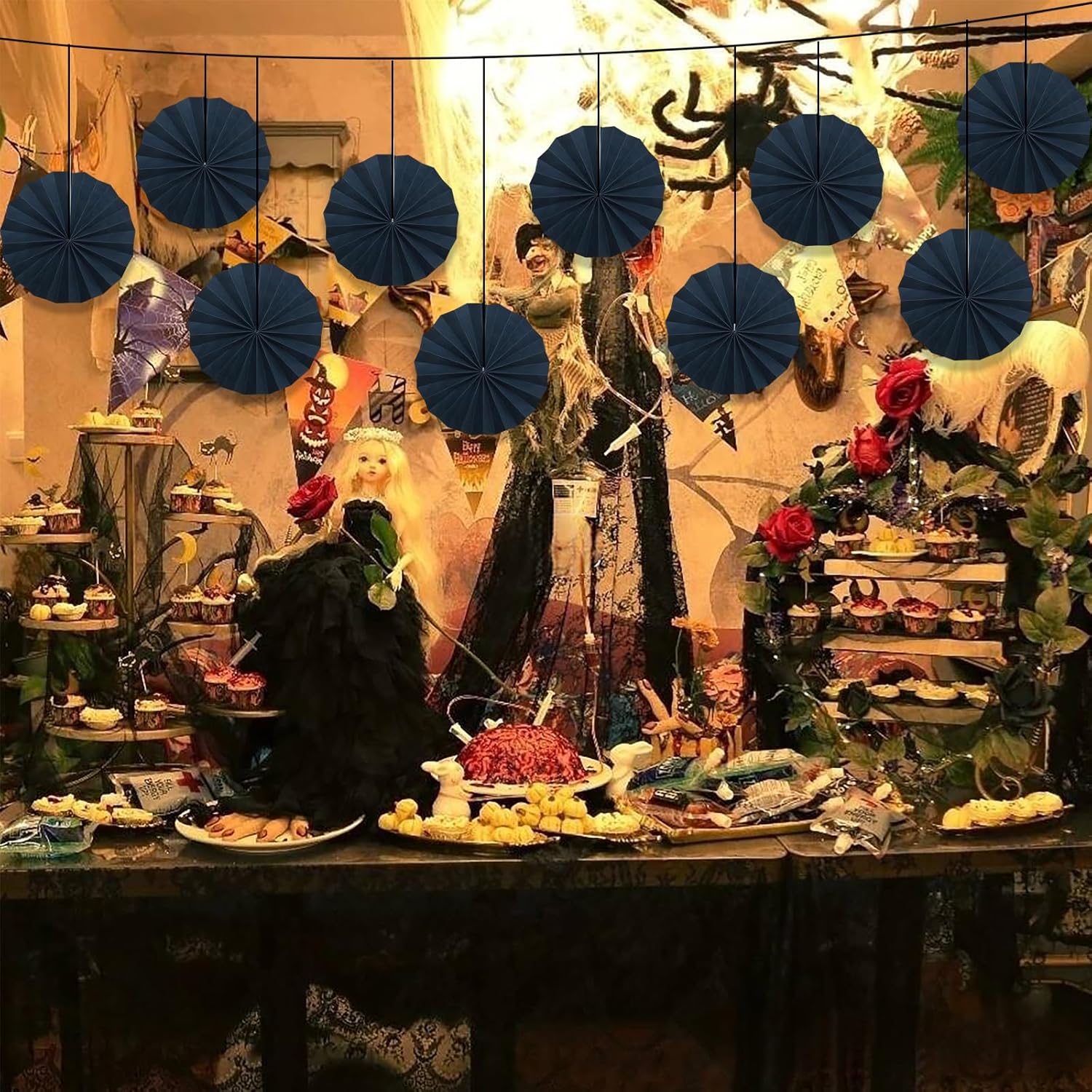 Black Party Decorations,Halloween Decor Events Accessories,Black Birthday Decorations,Anniversary Decorations for Party,Birthday Decorations for Men 8in Hanging Paper Fans 30 Color DIY Set(Black)